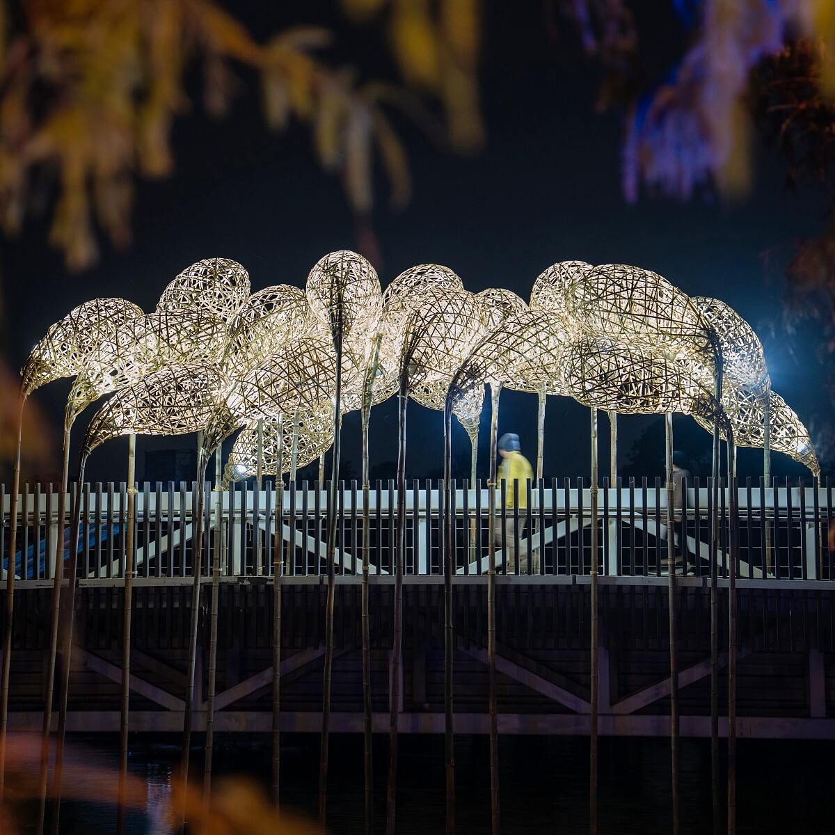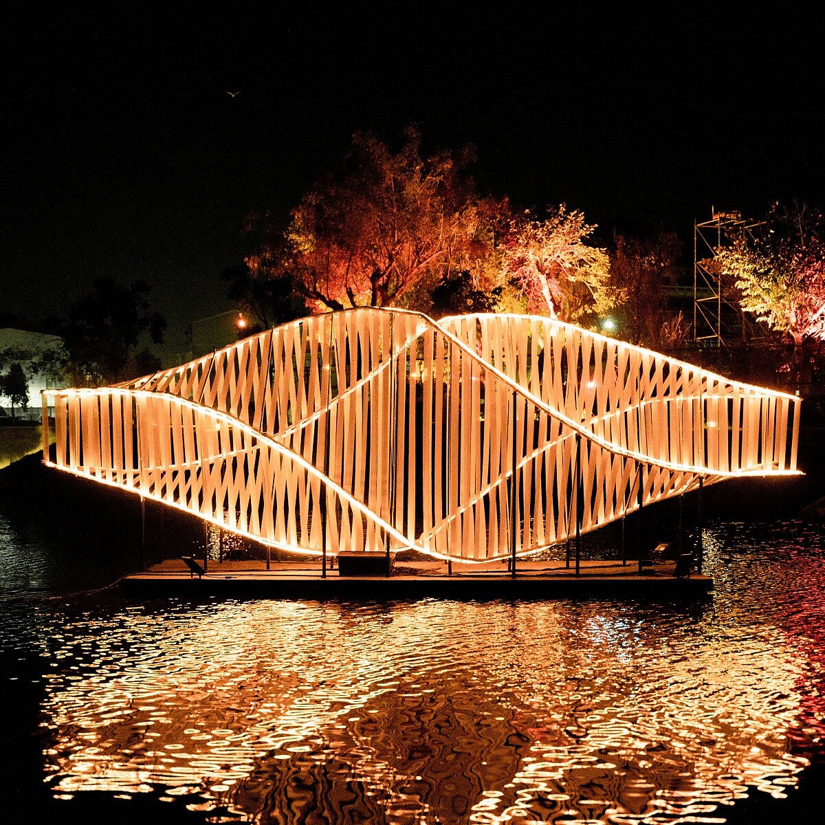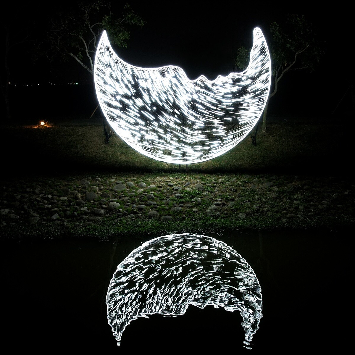 黑沿著河岸延展的光之結構,似雲亦似氣流,懸浮在水面上,隨風而動。當光影在水面閃爍,現實與倒影彼此交疊,形成一條介於自然與數據之間的界線。