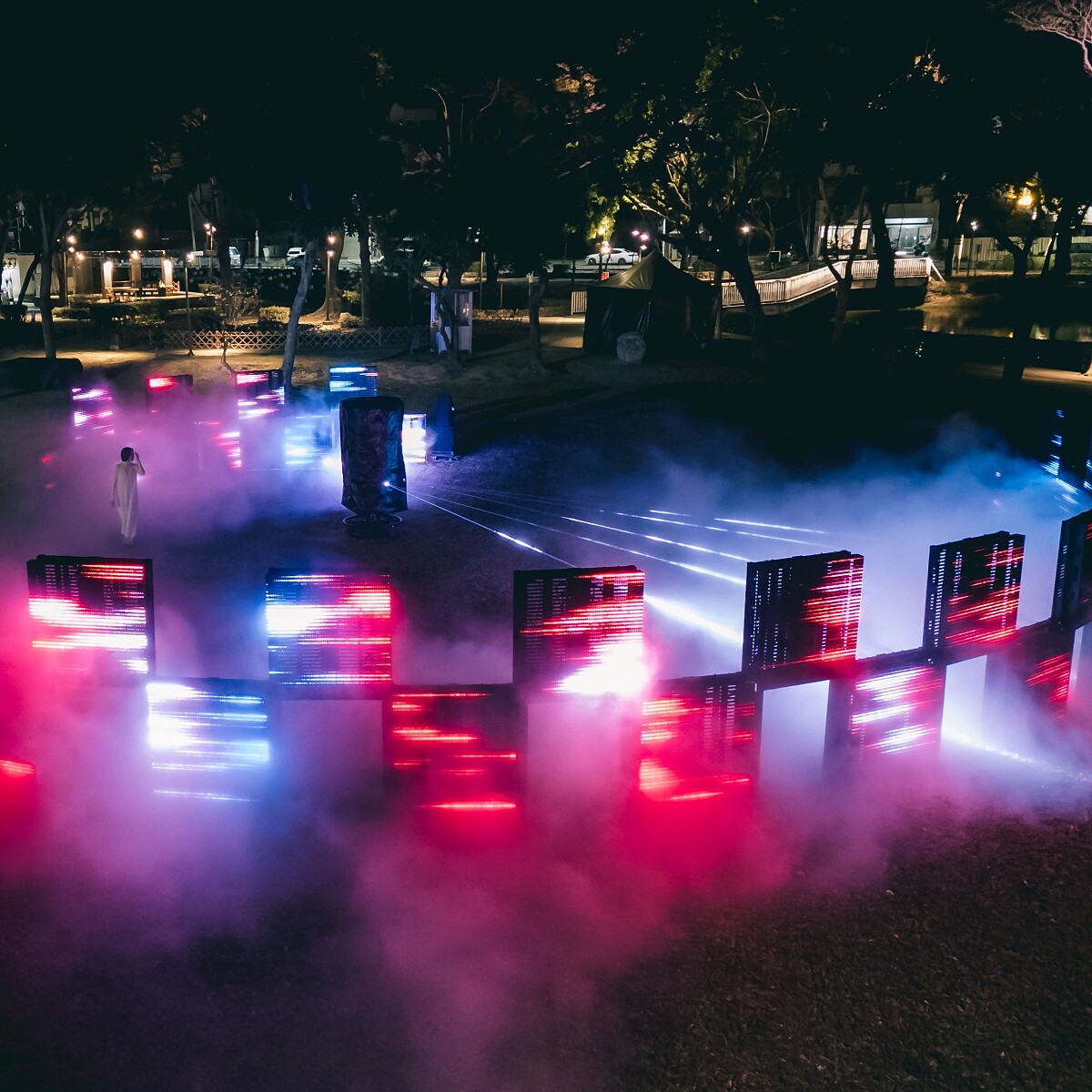 雷射與聲音在空氣中交錯,光束如蜂炮般迸裂,散成無數細碎的記憶。觀眾站在光牆之中,能感受到身體被聲波震盪,霧氣流動、光線折射,每一次閃爍都像在時間裡留下殘影。