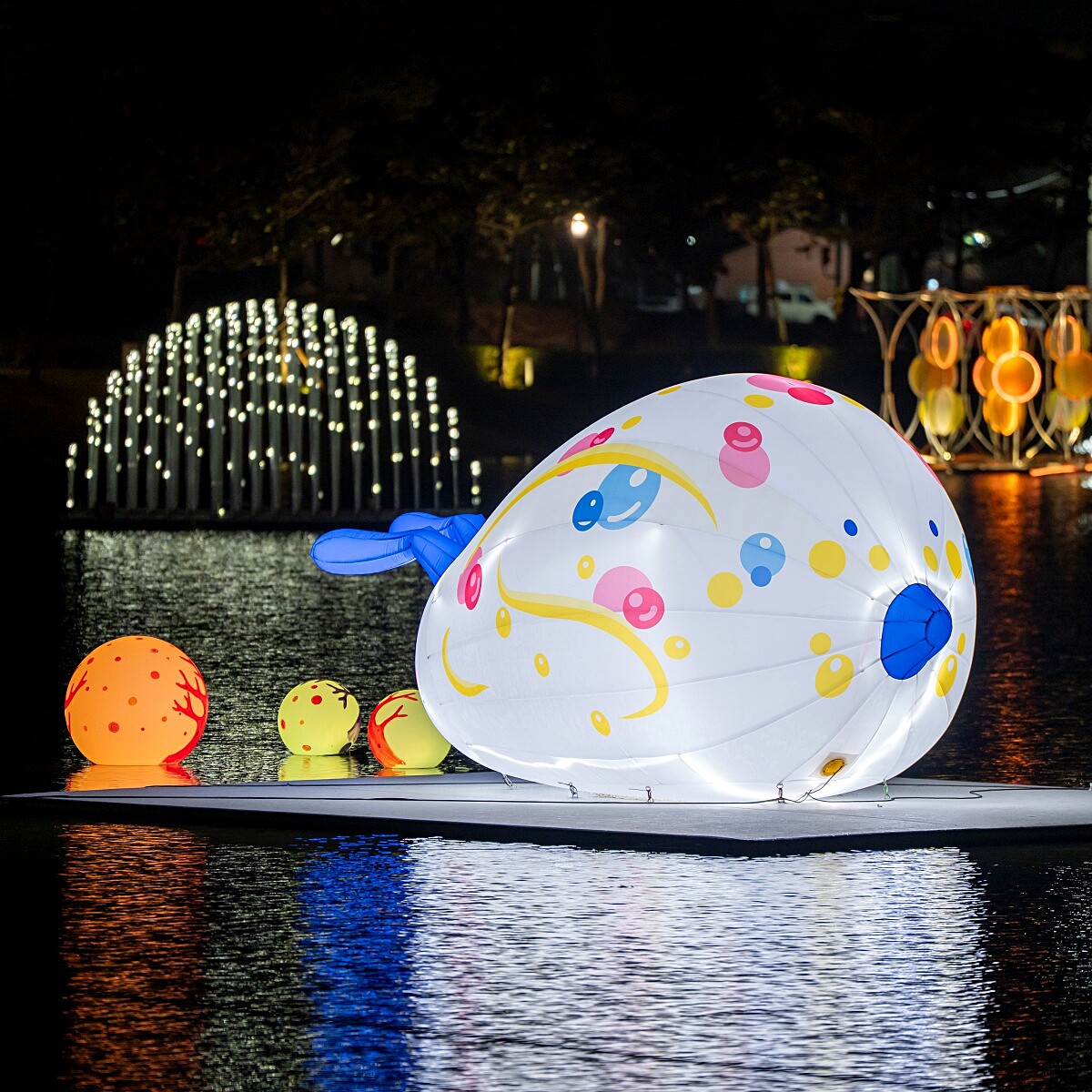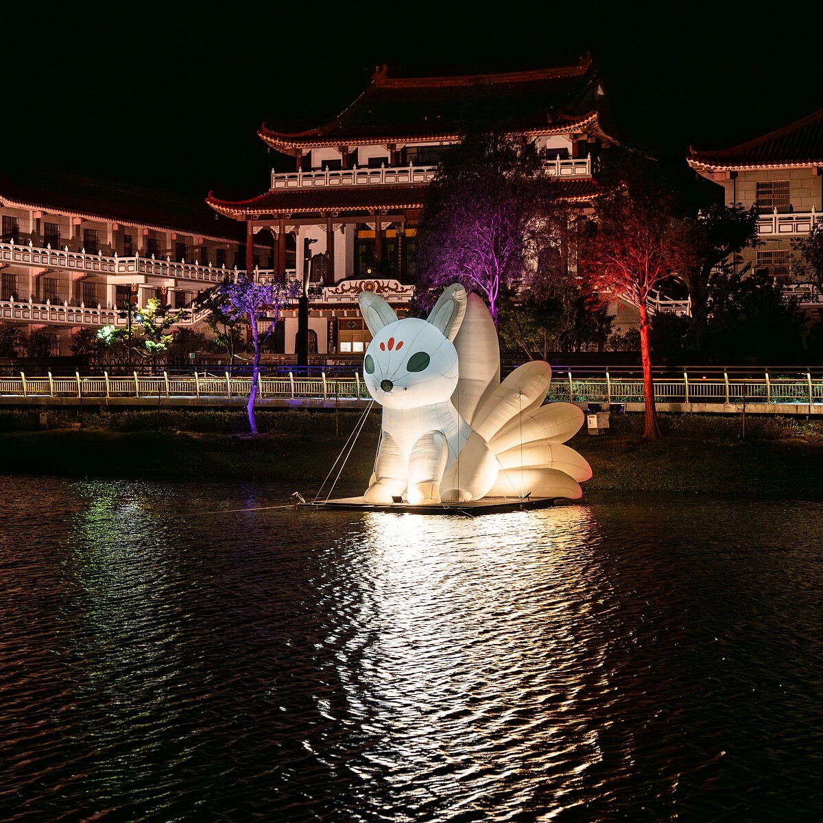 白狐靜靜佇立於霧氣與光影之間,九條尾巴如羽翼般展開,閃耀著微微的光。牠既是守護神,也是能量的化身,穿越雲端降臨人間,守望著流光溢彩的月津港。作品以氣膜結構塑造柔軟而發光的身體,展現靈性與科技的共生。