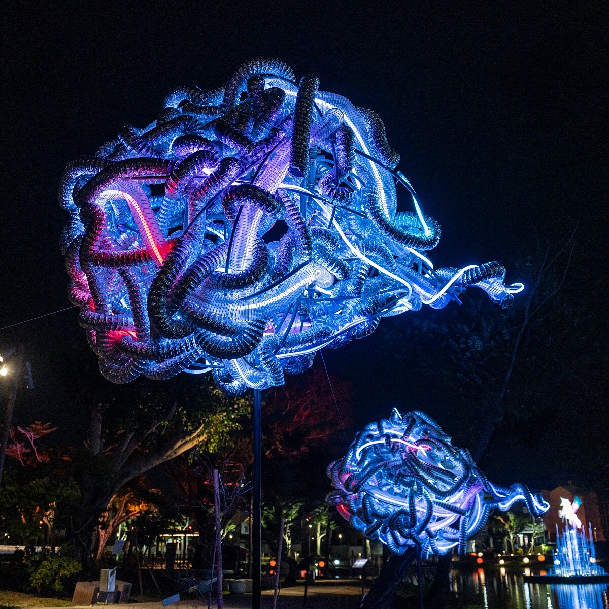 觀眾在岸邊凝視時,彷彿看見能量在河道中流動,光線成為資料的軌跡,將自然的呼吸轉化為資訊的節奏。作品以光作為媒介,揭示科技與自然的互滲關係,使雲端的展覽主題具體化於鹽水的水域之上。