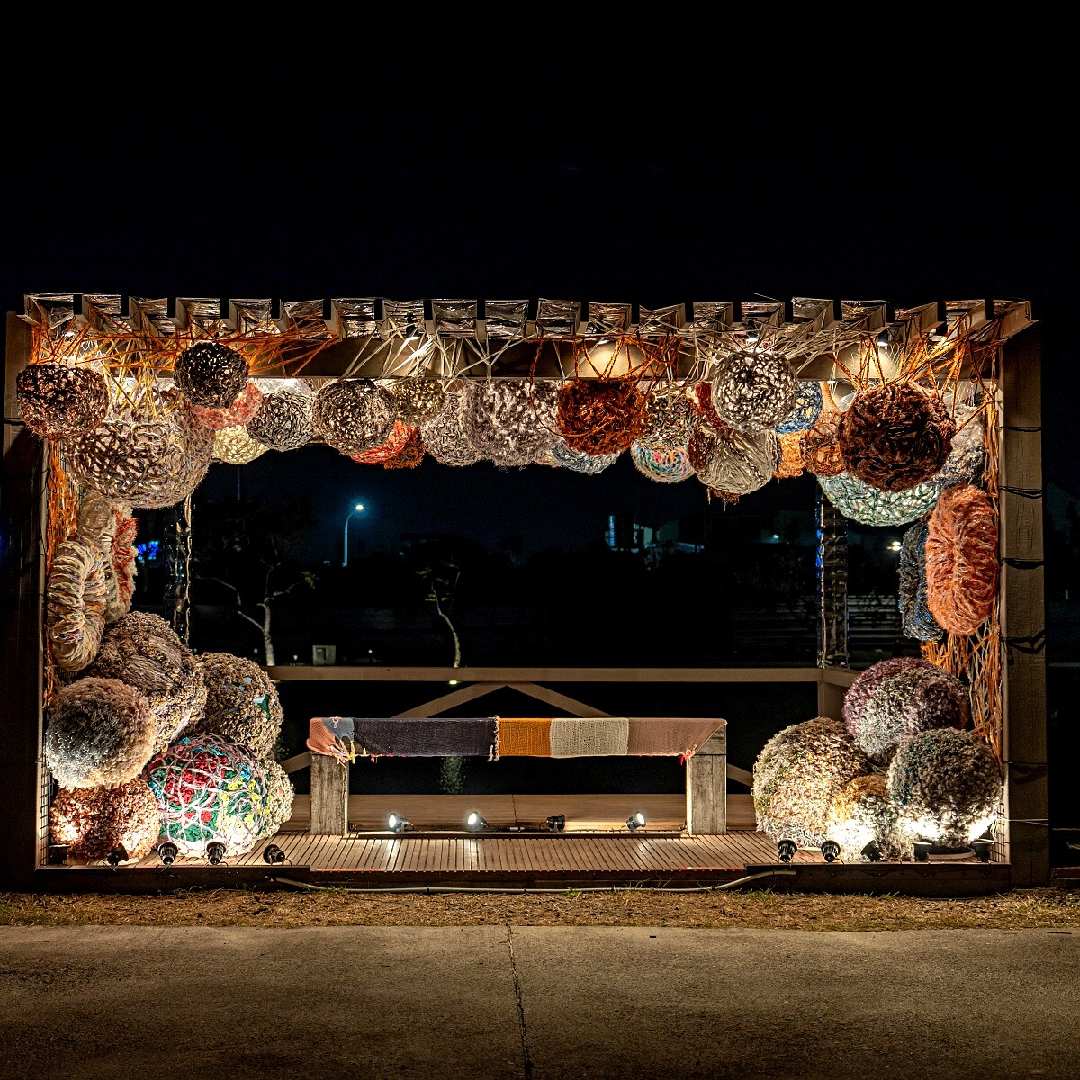 作品透過時空與物理尺度的錯置,使光穿透編織纖維時形成如菌絲般的有機幻影,在微觀與巨觀之間流動延展。