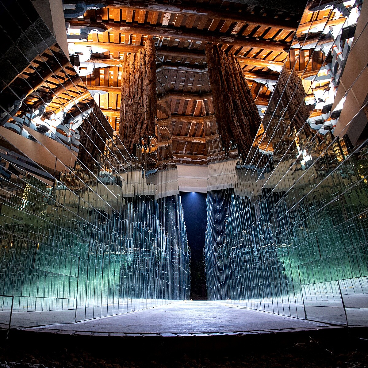 透過光的流動開啟了通道的入口,一座四股螺旋的光之通道橫亙於河道之間,側看如一座連接兩地的橋體。觀眾以視覺穿越其中,彷彿走入時空縫隙。光與霧在結構間交織,空間在視角轉換中扭轉。