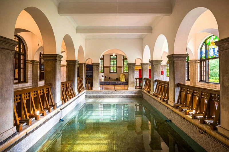 前身是建於1913年的「北投公共浴場」,採和洋折衷的紅磚建築,曾是東亞最大的溫泉浴場。斜頂木造建築與彩色鑲嵌玻璃交織出濃厚的異國風情,最吸睛的是地下一樓如羅馬浴場般的大浴池,四周環繞著拱廊與雕柱。