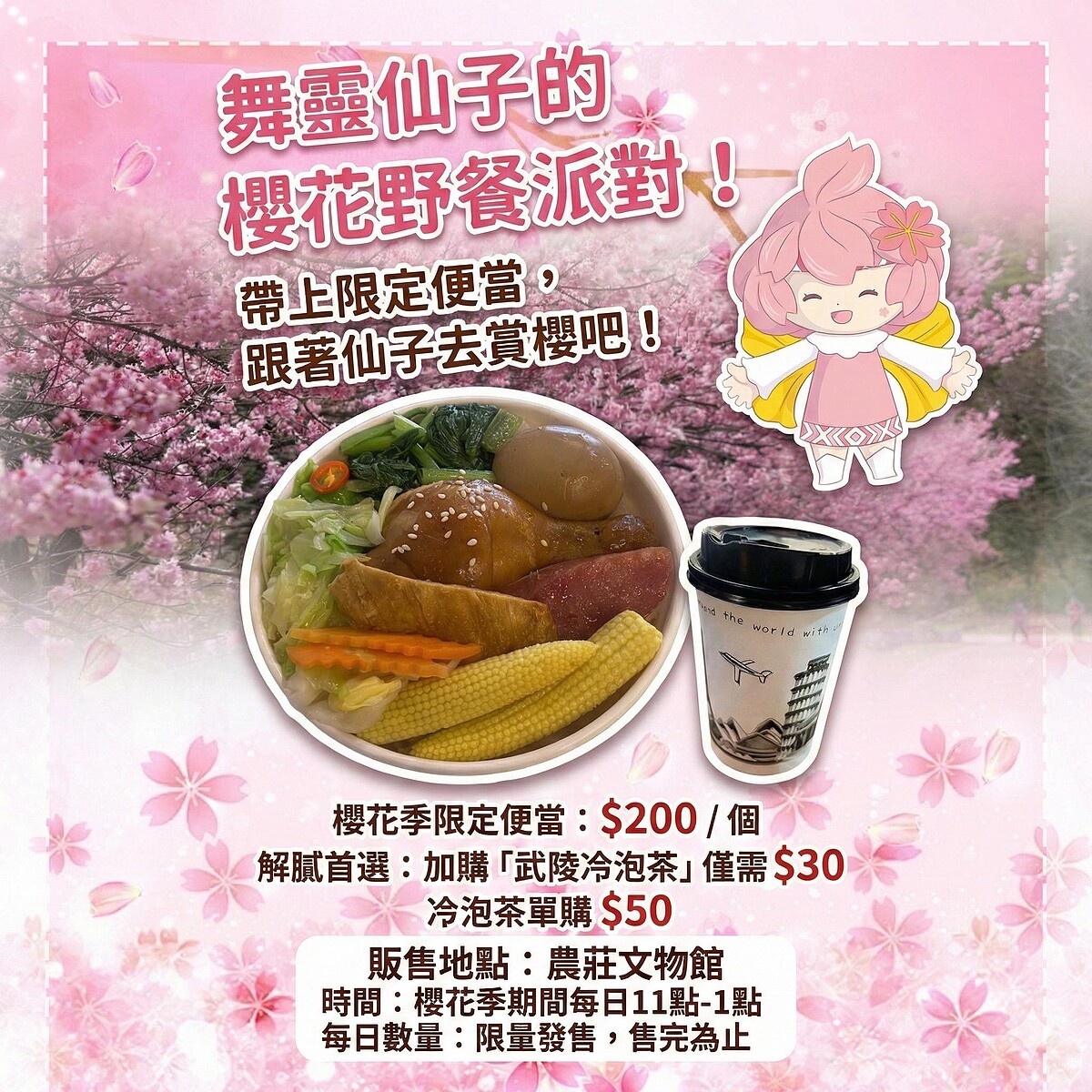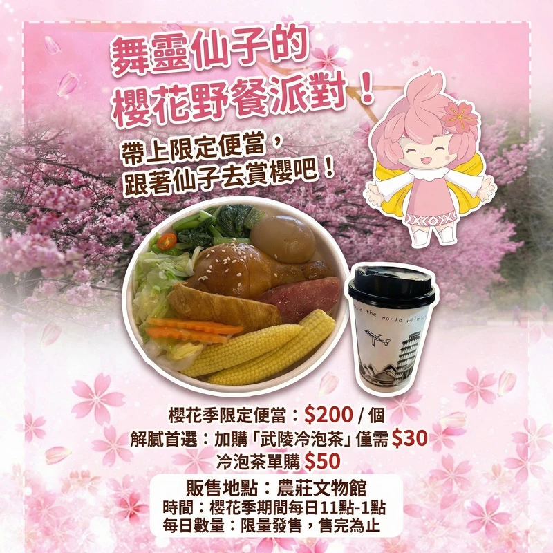 賞櫻時間也別讓肚子餓到!2026武陵農場櫻花季特別推出「櫻花季限定便當」,活動期間每天於農莊文物館11:00 - 13:00限量發售。售價200元、能享受飽滿配菜春日滋味,在草地上野餐享用完全太幸福!另外還能以30元加購「武陵冷泡茶」,單購價為50元。