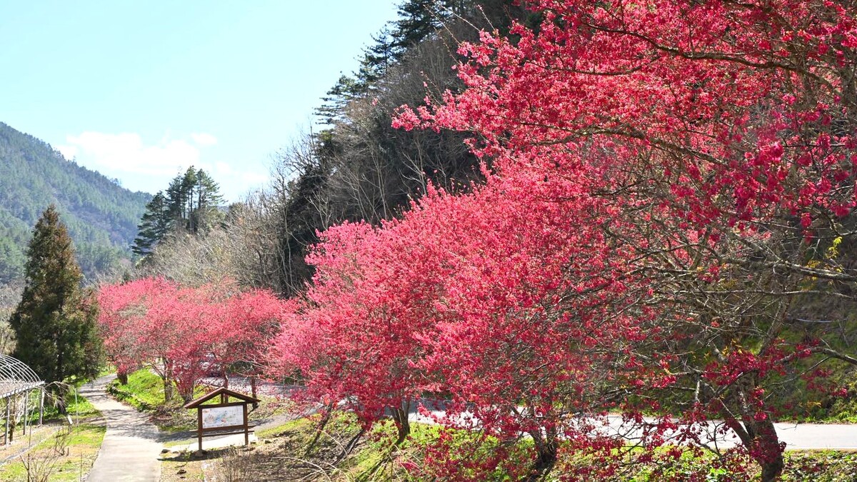 桃花莊&醒獅園:這兩處的「山櫻花」目前正值觀賞期,整片緋紅花海在晴朗蔚藍的天空映襯下,顯得非常壯觀又迷人。