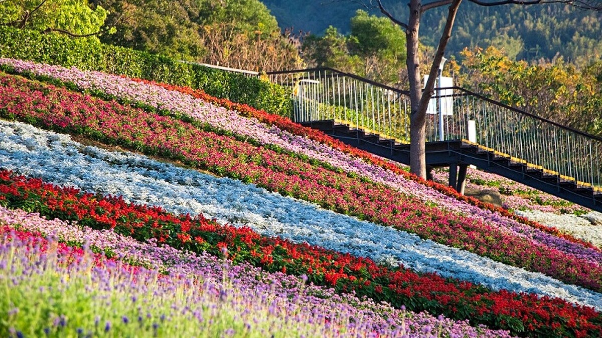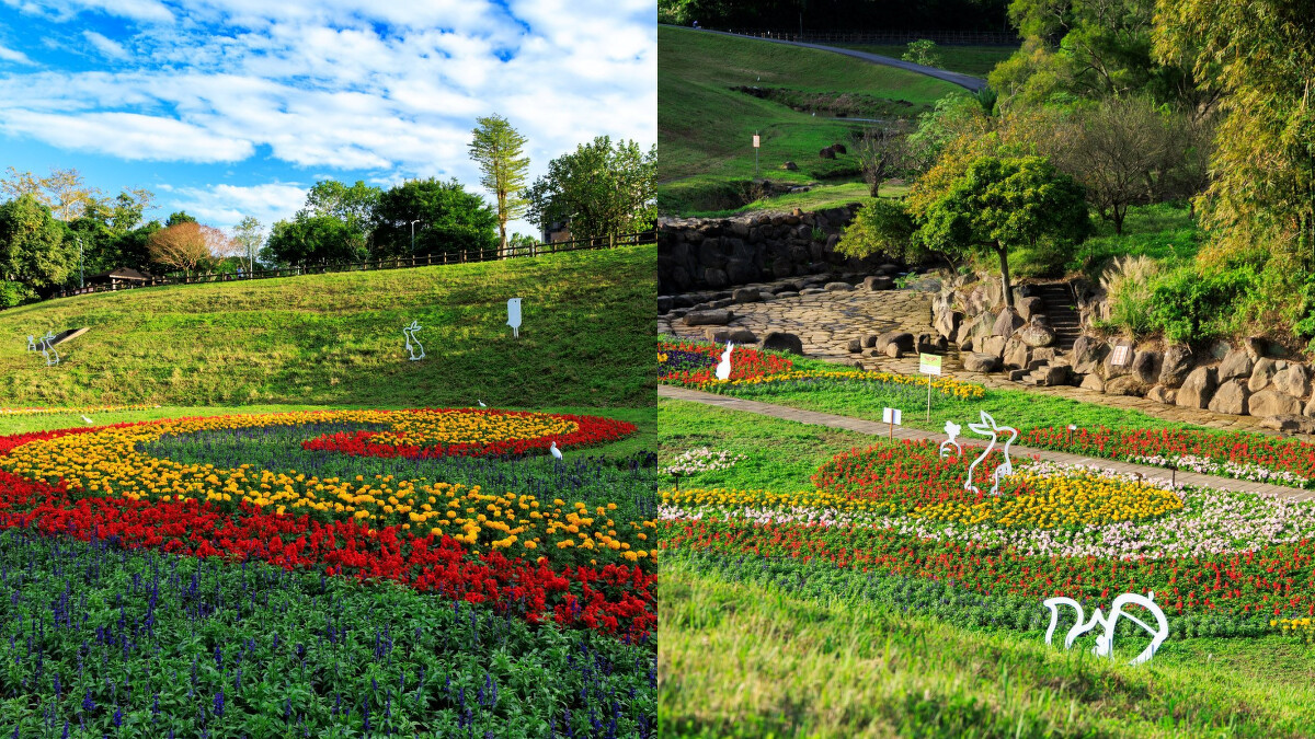 號稱「台北市賞花秘境」的內湖大溝溪生態治水園區,已率先於1月綻放繽紛花海!225坪占地面積裡,一串紅、粉萼鼠尾草、萬壽菊等2.6萬盆草花陸續盛開,今年更以「水淵」水紋意象為概念,讓綠坡上的花海圖騰宛如水流般延展開來,另外巧妙設置小動物裝置,位旅客帶來兼具繽紛又趣味的視覺饗宴。