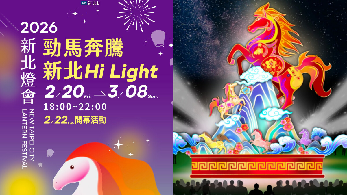 繼2025年新北燈會受到超過490萬人響應朝聖,2026新北燈會場地比去年大兩倍、主題燈區也由10區擴增到16區,最大看頭「勁馬奔騰」主燈以童話故事繪本發想,更結合LED燈光投影,帶領民眾走進一段童趣想像、光影科技與在地文化的奇幻旅程。每晚6點~10點、每半小時就會有一次3分半的360度震撼展演,象徵馬年活力全開,帶有「馬上好運、馬上有錢」美好寓意。