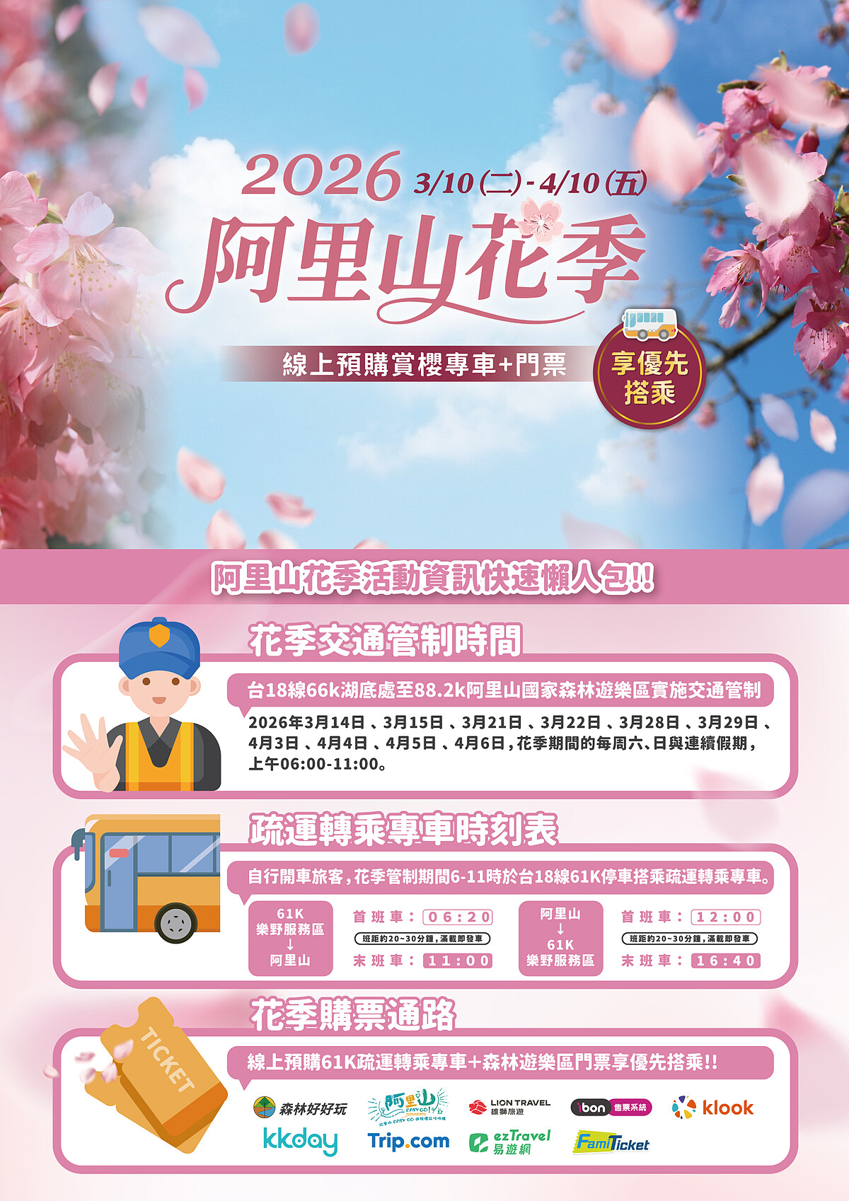 在全台先後進入春季限定的櫻花美景後,眾所期盼的「2026阿里山花季」也將壓軸登場!今年花期照樣維持約一個月的時間,園區內多達31種櫻花會山谷染成春意盎然的繽紛色調。我們整理好8種櫻花盛開花期、最佳觀賞景點,以及交通管制資訊、疏運轉乘專車資訊。還可以搭乘賞櫻主題列車來個難忘的粉紅一日遊,有興趣的人快安排上山囉!