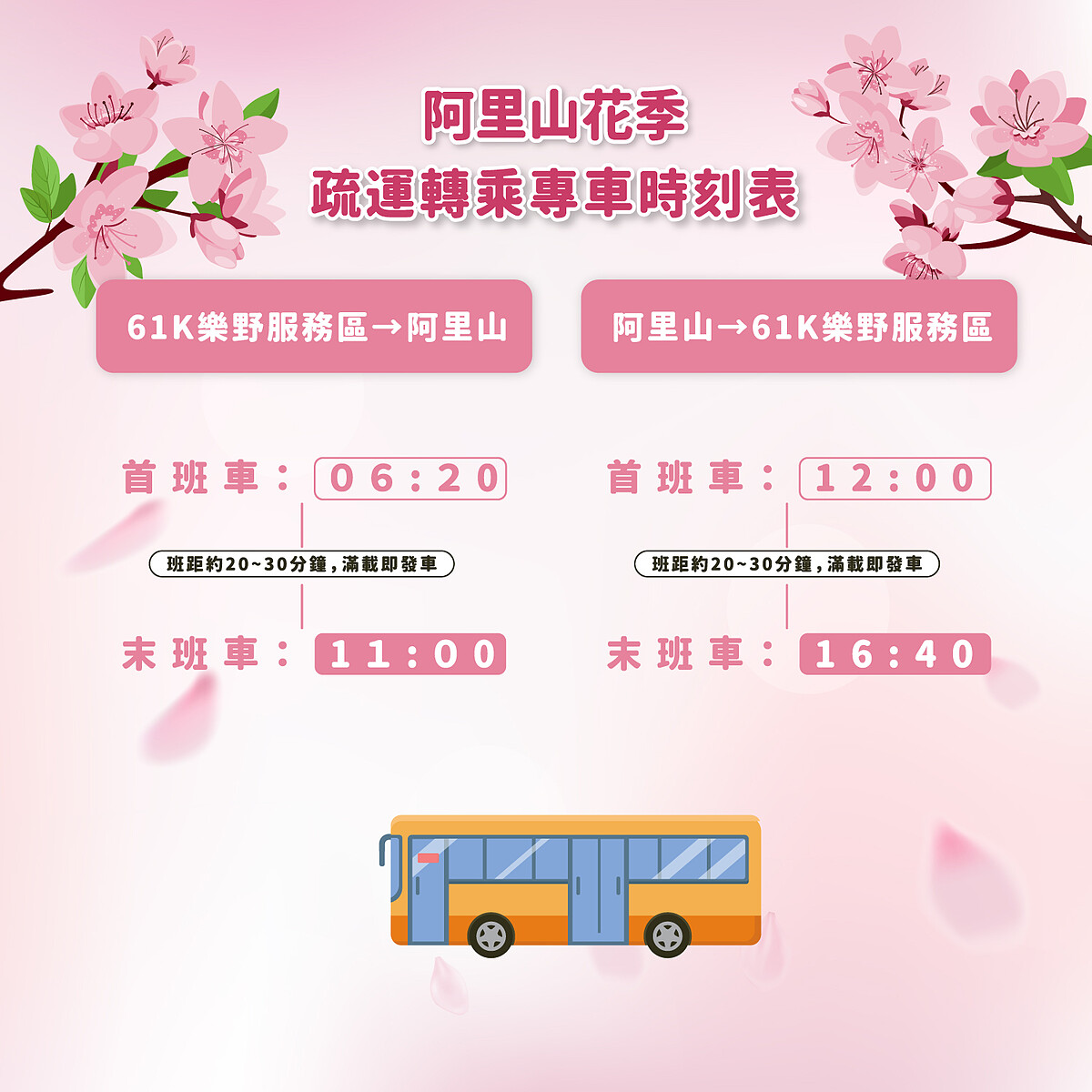 .阿里山→61K樂野服務區(回程):首班車 12:00/末班車 16:40