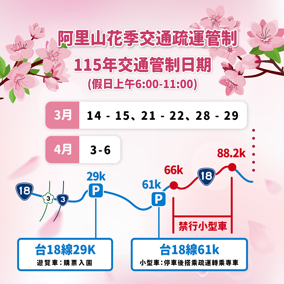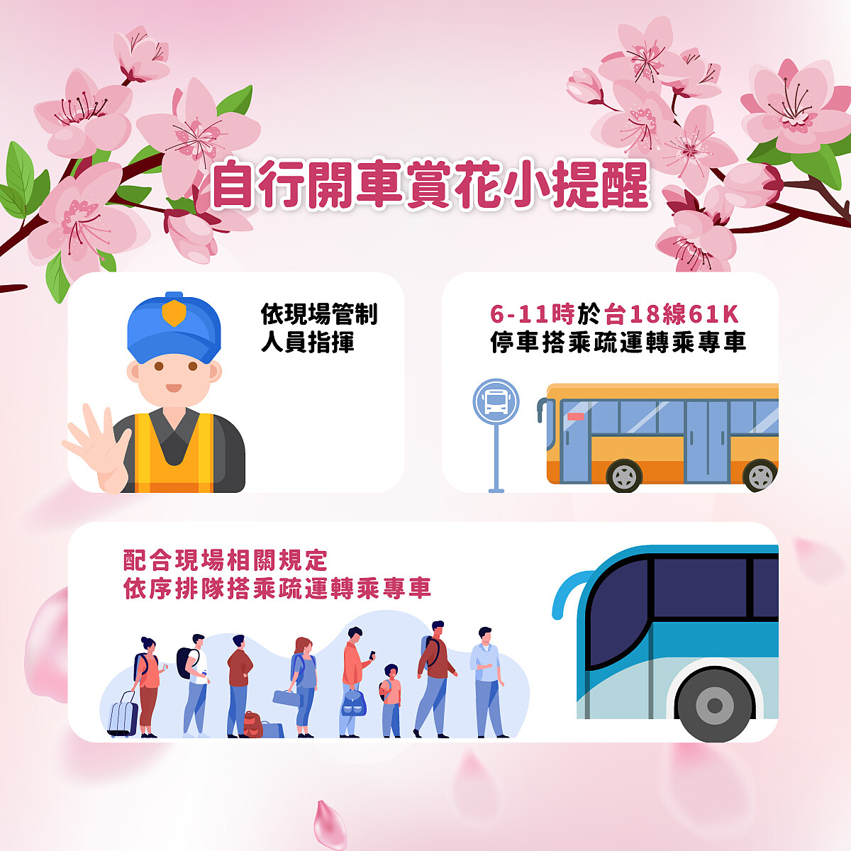 在3/14、15、21、22、28、29 及 4/3~6(共10天)的上午6:00~11:00,會於台18線進行交通管制,自行開車的旅客須至61K樂野服務區轉搭「花季疏運轉乘專車」才能上山。