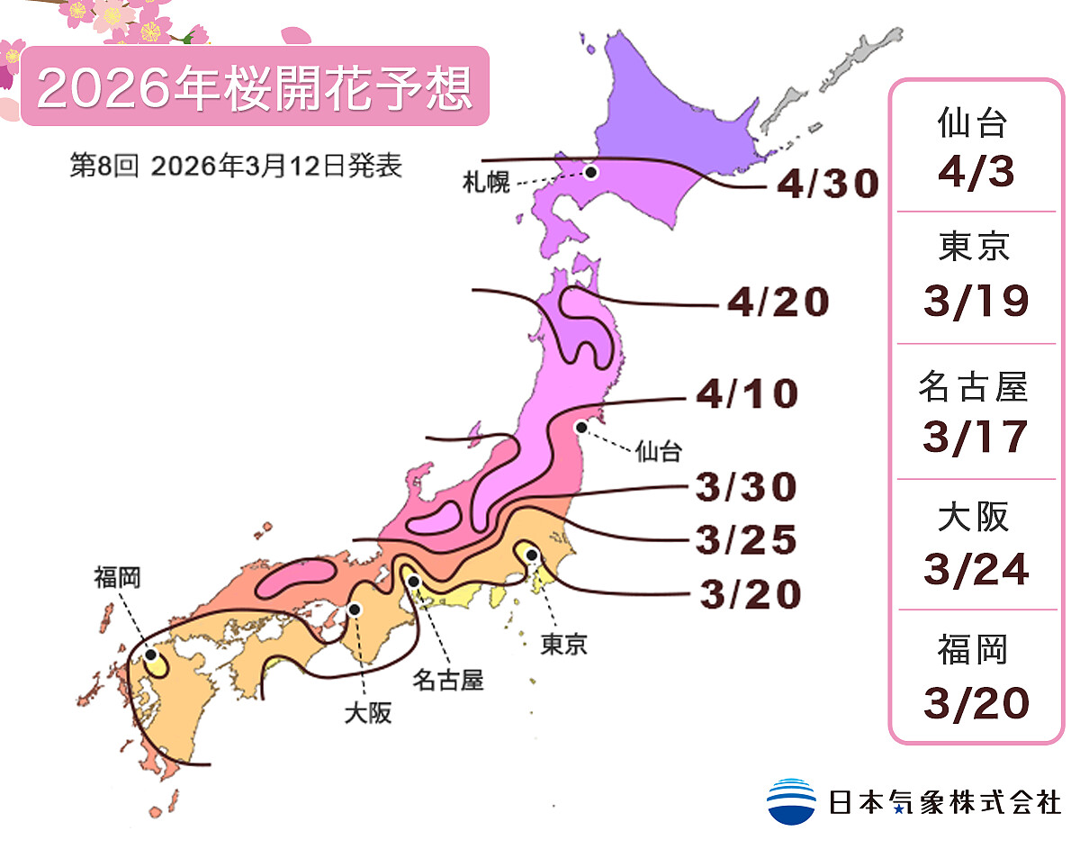 掌握櫻花的「綻放節奏」是規劃行程的核心。根據「日本氣象株式會社」於3/12發布的第8回預測,今年日本氣溫預計高於往年,這意味著「櫻前線」將會提早報到。東日本(如東京、仙台)受暖冬影響,花期預計比往年提早約4~5天,從3/19左右就會開始開花,最快3/27會達到滿開。而西日本(如大阪、福岡)則大致維持在往年水準。