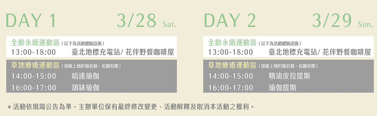| 三大主題野餐區 | 咖啡派對(DJ/職人手沖)、美力運動(瑜伽)、親子毛孩(Dress Code)。 | 親子毛孩區記得穿上「粉色與白色」參與裝扮秀。 |