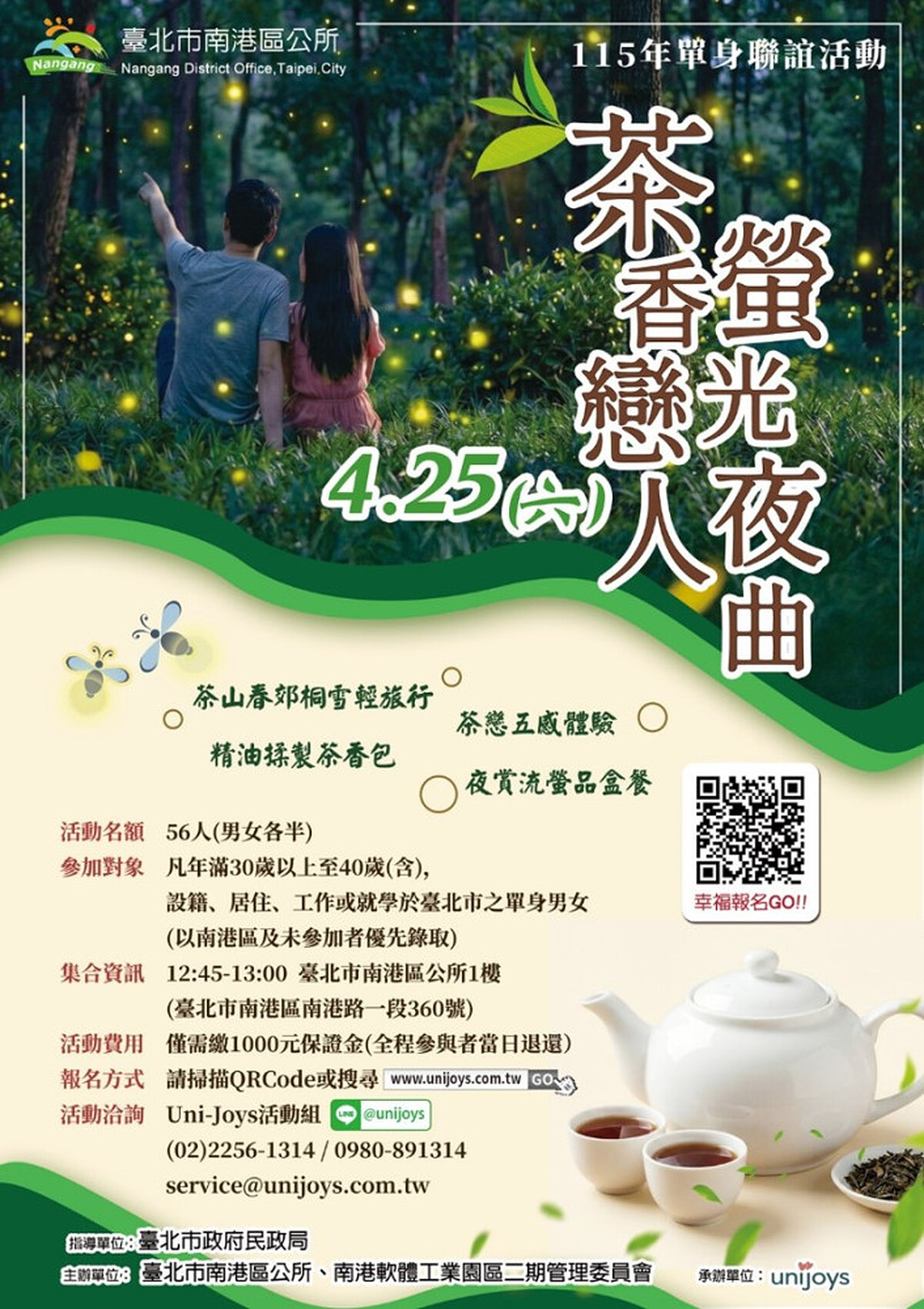 | 南港茶葉示範場 | 單身聯誼、茶山春郊賞螢 | 4/18 - 5/3 | 聯誼活動限額 56 名,茶山春郊為自由參加。 |