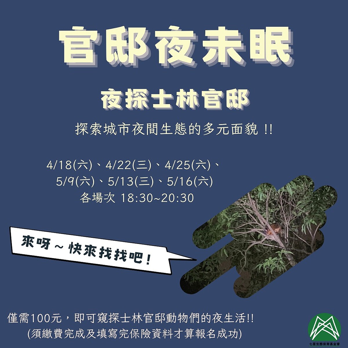 「官邸夜未眠-夜探士林官邸」:4/18、4/22、4/25、5/9、5/13、5/16晚間18:30-20:30舉行,集合地點為大門口駐警室。每場限20名,需收報名費每人100元,4/1起於七星生態保育基金會官網或粉絲專頁開放報名。