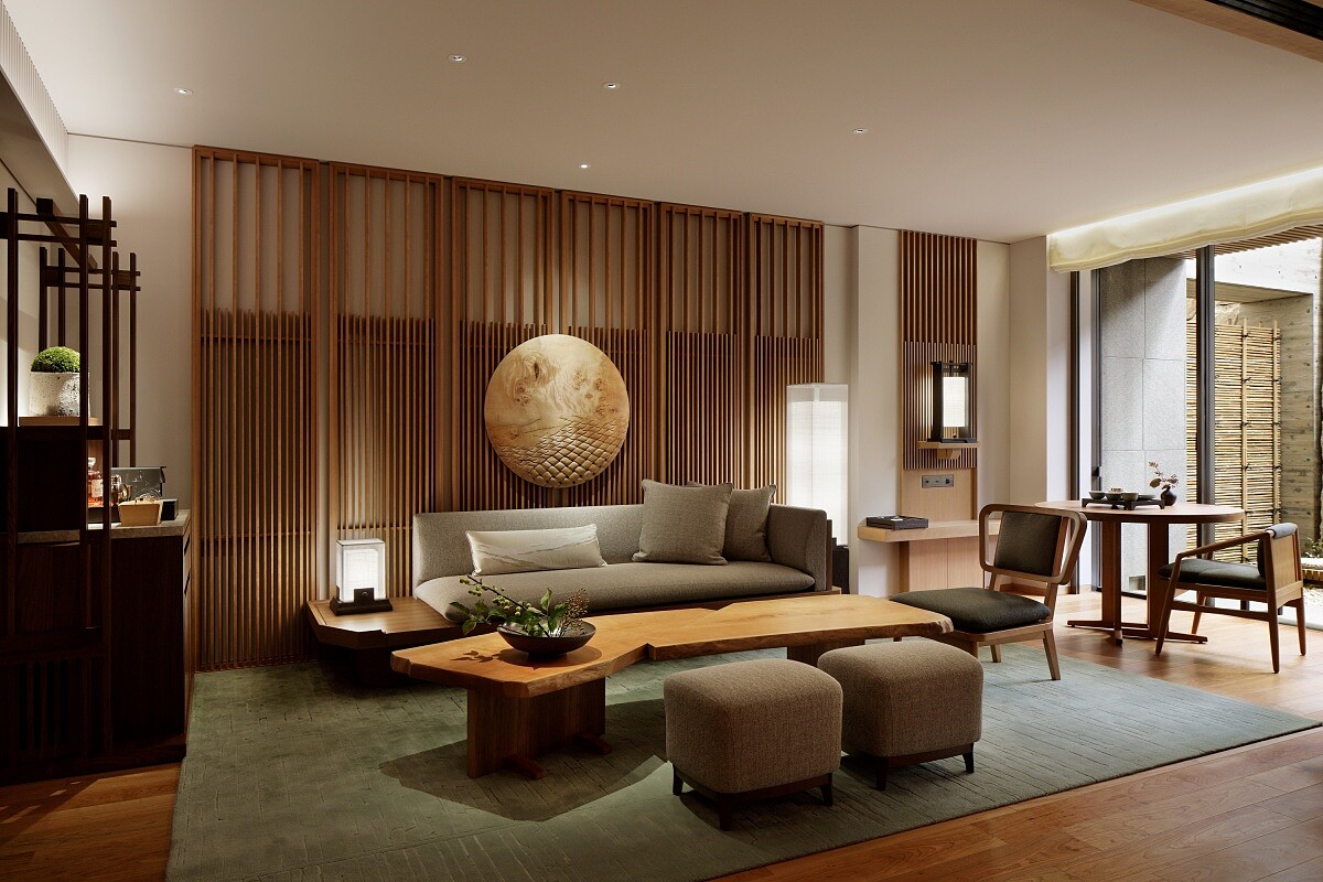 最特別的是房內配有私人的露天溫泉,泉水直接引自飯店地底。空間將客廳與臥室分開,裝潢細節大量使用櫻花木與職人工藝。湯池旁就是日式庭園景緻,隨時都能享受泡湯的樂趣。