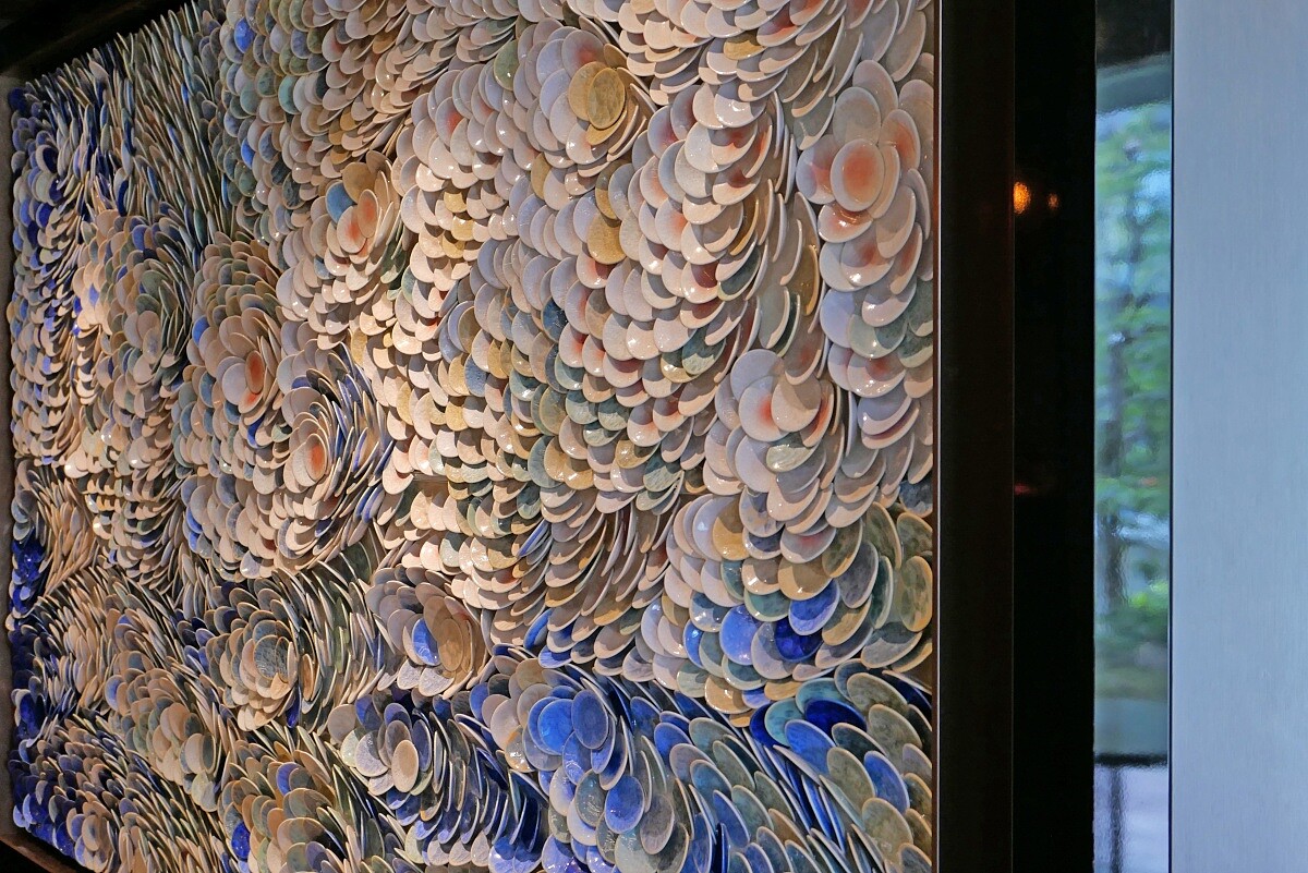 除了餐點,店內還有一面用三千個「清水燒」小碟拼成的藝術牆,直接把京都具代表性的陶器工藝,變成了現代十足的創作。此外,這裡也是所有住客享用早餐的空間。