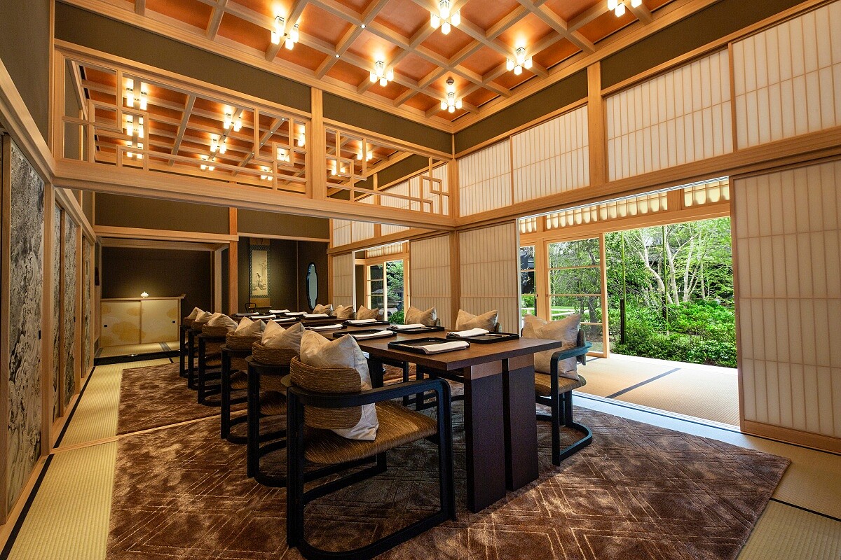 過去是三井家宴客場地,隔間拉門上有日本畫家朝倉隆文繪製了庭園四季,可選擇享受飯店內兩間餐廳的料理。
