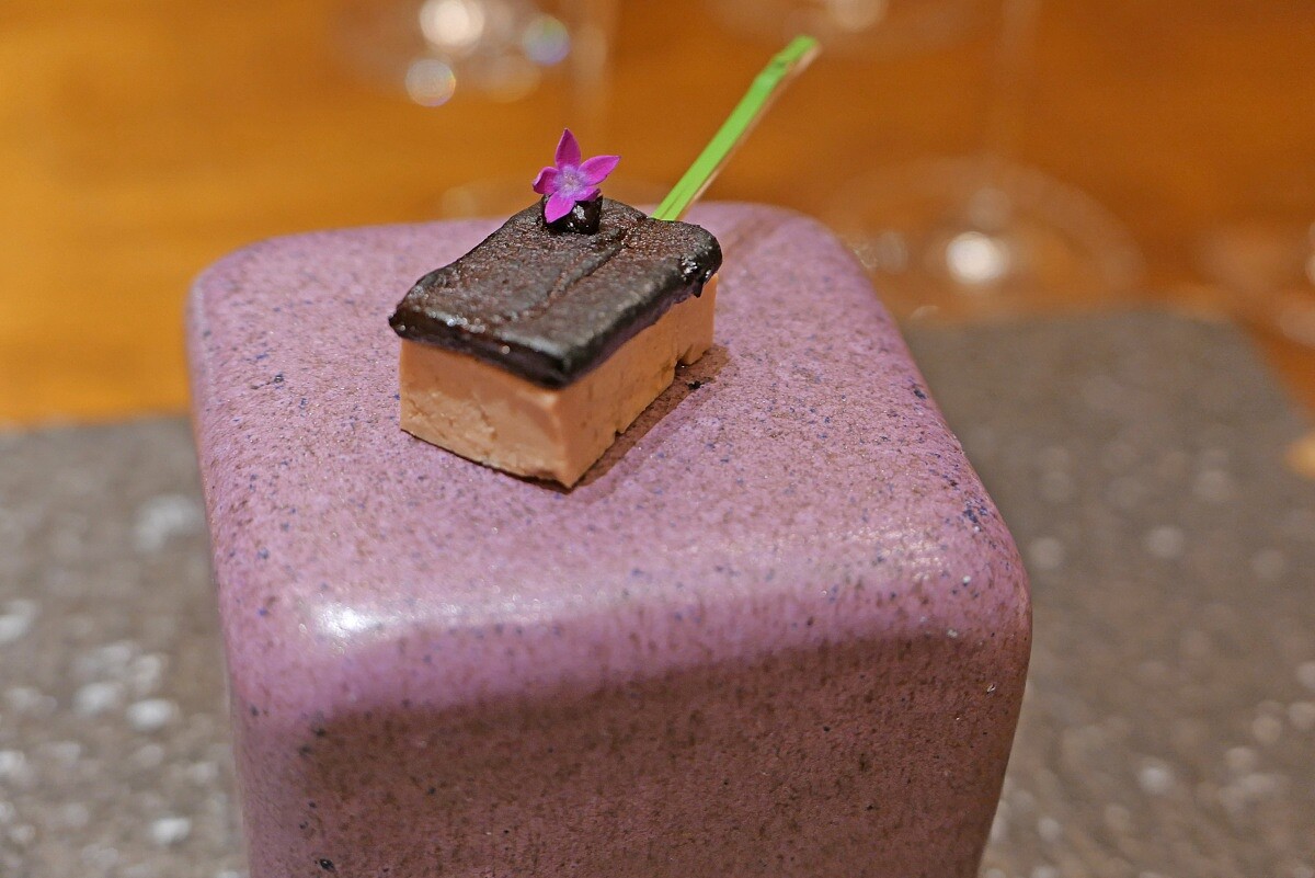 在抵達第一晚我們就在此享用豐盛的餐點,這是一場圍繞「水」展開的京都法餐體驗,主廚巧妙地將法式底汁與日式高湯結合,展現京都軟水的風味。 印象最深刻的是一道「伊根酒粕配鵝肝」,主廚選用向井酒造經過熟成的酒粕,吃起來竟然散發著一種如可可般的深邃苦甜感,發酵後的厚實韻味,剛好中和了鵝肝的豐腴油脂,讓原本厚重的食材變得耐人尋味。