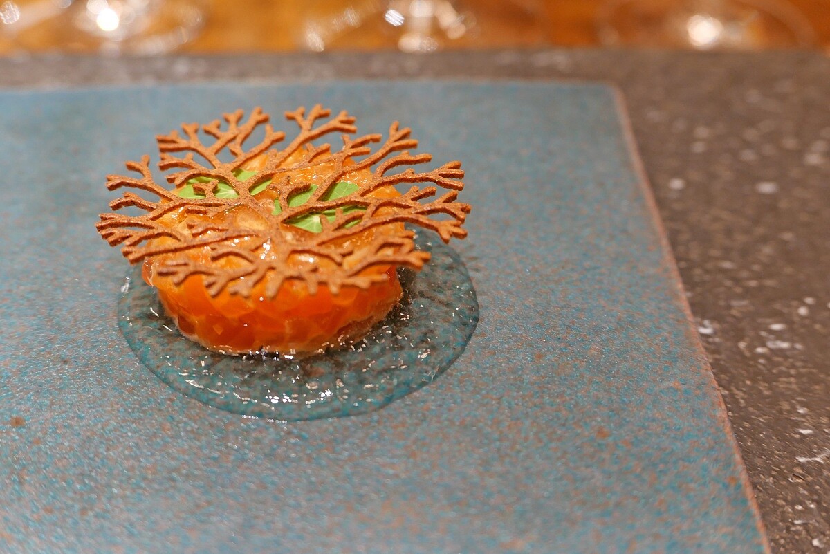另道經典的招牌菜「煙燻鮭魚」,主廚選用鳥取縣大山軟水養殖的鮭魚,盤底以清透高湯凍象徵大海,中間堆疊鮭魚塔塔與魚卵,最後覆蓋上一片以魚骨和魚皮製成的脆餅,其口感質地接近法式酥餅(Sable)的細緻,還帶著優雅的甜味。不僅美味,還展現了食材零浪費的永續精神。