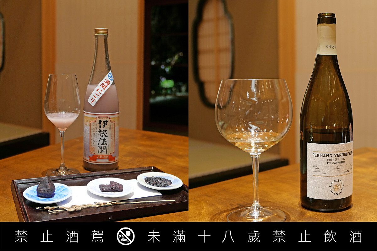 酒水部分,從京都伏見的名水開場,席間更選用了帶有熟成韻味的「伊根滿開」赤米酒來驚豔味蕾,最後再以法國勃根地一級園的經典紅白酒收尾。從在地風土跨越到法國名莊的搭配,讓整場晚宴的層次感更加完整。