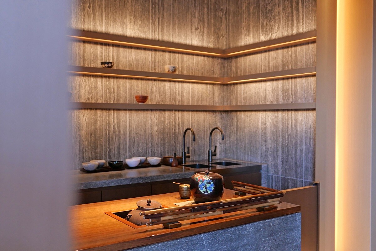 接著踏入室內,是由設計師傅厚民(André Fu)以「現代茶室風格」打造的空間,首先是刻意壓低的天花板與泉田之也的陶藝作品《風》,接著走進高挑落地的窗與一覽無遺的中庭庭院,André Fu 將茶室最重要進入、過程、轉變的過程,濃縮在這一低一高、一暗一明的切換裡。