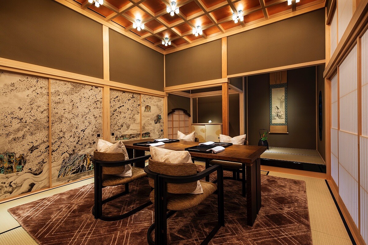 這裡是飯店一處重要的空間,其原型為三井家以前用來招待貴客的「奧書院」,飯店特別邀請曾參與京都御所修復的「安井杢工務店」,以全檜木重新打造。 裡頭的設計細節相當講究,是由茶道流派武者小路千家的後嗣——千宗屋先生親自監修,他在深度達一間(約1.8公尺)的床之間(壁龕)裡,依照京都的歲時記與三井家的歷史,每個月更換不同的佈置。榻榻米上也設計了煮水用的下沉式爐,讓這裡能作為正式的茶席或容納16人的私人用餐包廂。
