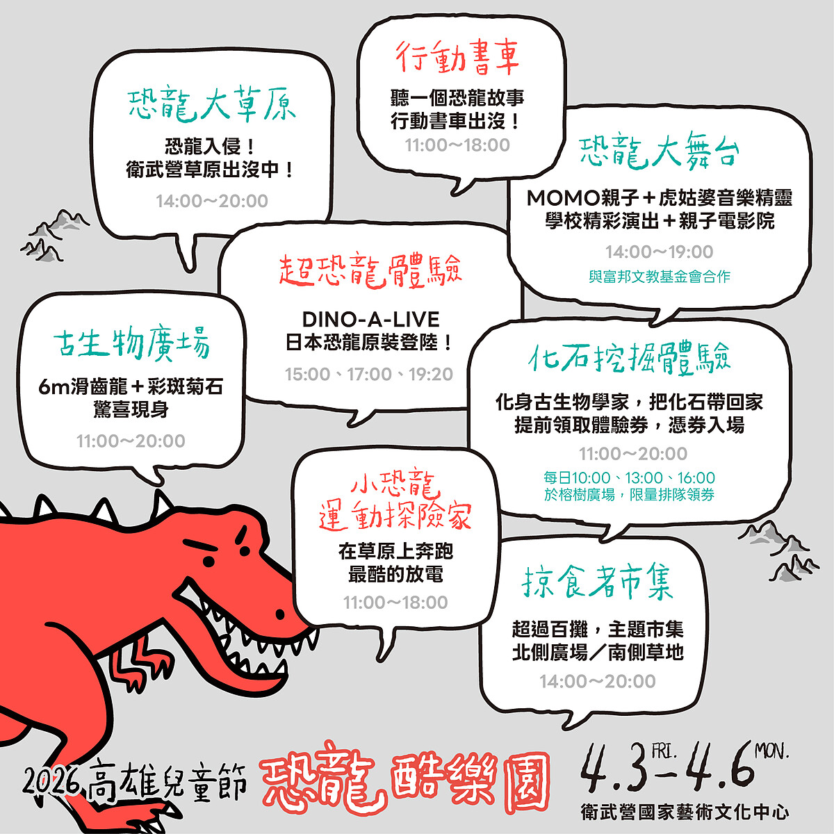 兒童節連假要帶孩子去哪裡放電?今年高雄市政府再度祭出重量級親子活動,直接把衛武營變成超大型「恐龍酷樂園」!4/3~4/6連續四天,不僅有來自日本的頂尖擬真恐龍團隊DINO-A-LIVE首度來台演出,更規劃許多親子活動,如化石考古體驗、恐龍主題市集等等。我們特別整理完整懶人包,帶你一次掌握「恐龍酷樂園」活動亮點與交通攻略,輕鬆跟孩子玩遍這場節日限定派對!