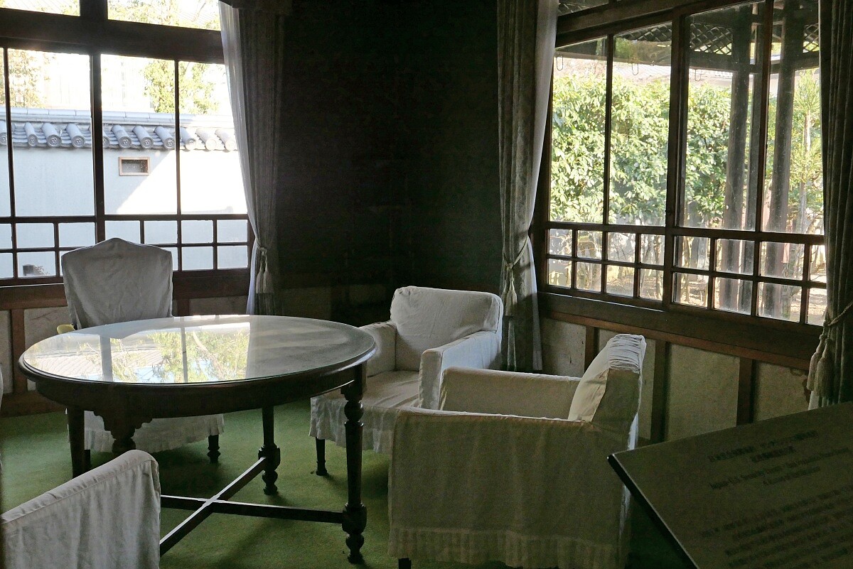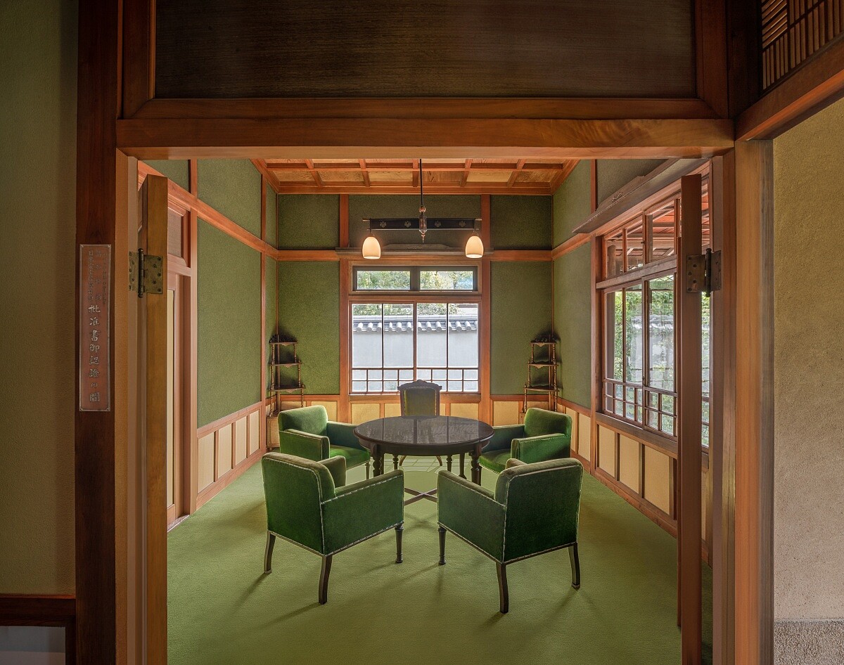 在偌大的空間中鑲嵌著大正時代玻璃窗、格子天花板、深綠牆面,搭配上微微垂落的黃色窗簾,整個空間像是停在那個迷人的年代般。緊鄰的則是昭和天皇1951年(昭和26年)簽署《美日安保條約批准書》的歷史現場,完全能感受到時間在這裡安靜地並存,那段歷史也變得不那麼遙遠。