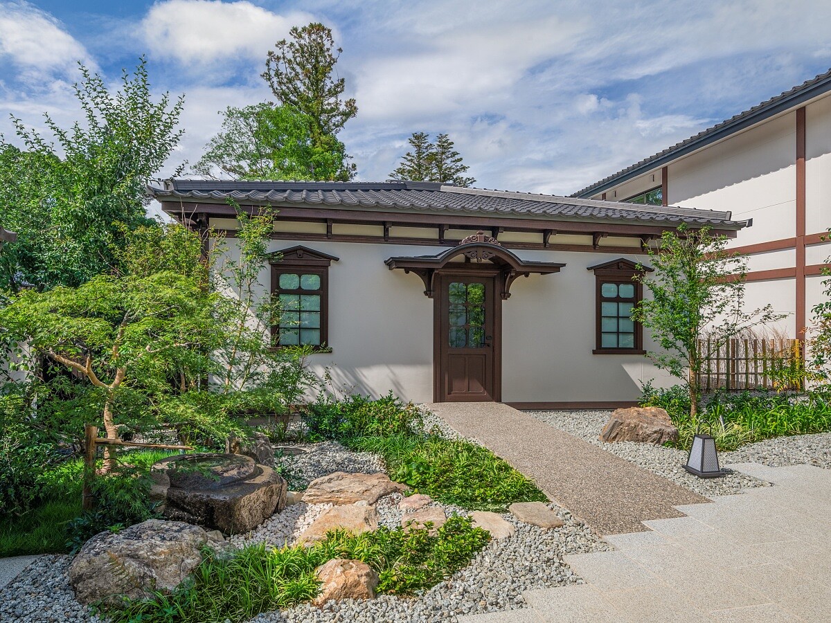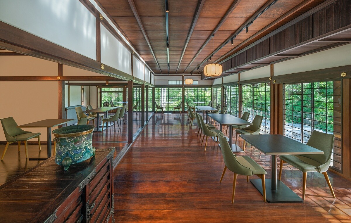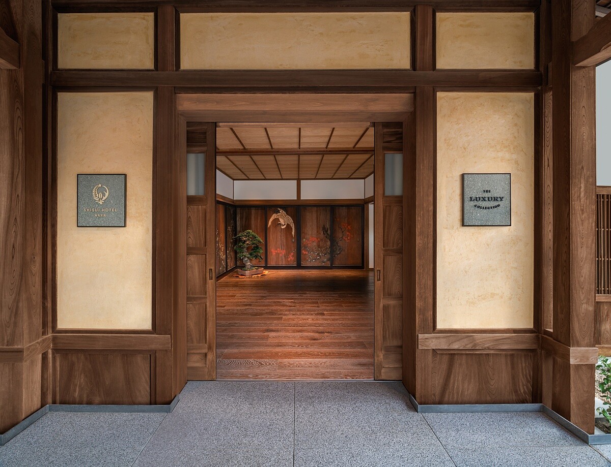 飯店的前身是1922年落成的「奈良縣知事官邸」,建於大正時代,並見證了整個日本二十世紀起伏。在二戰結束六年後,昭和天皇曾正式下榻於此,集團行銷總監佐藤佳子提到入口的大門至今幾乎沒有改變。在「森トラスト」集團接手後,邀請建築大師隈研吾重新設計,他捕捉到傳統倉庫入口的弧形輪廓,把其形狀轉化為室內空間的分界語言。只要穿過這道圓潤的門廊,就像潛入另一個時間層次。