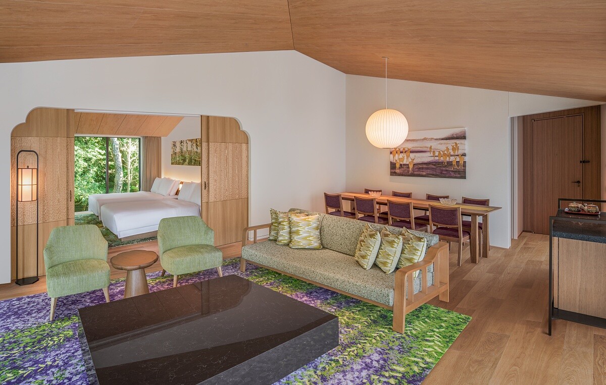 雖然飯店整體佔地約30,500平方公尺開闊空間,卻僅僅設有43間客房、8種房型、23間配有私人溫泉或露天風呂,從約40平方公尺到最大的92坪。客房區與主建築之間以一條名為「時之道」的公共步道串連,必須走到戶外才能抵達。這段過程讓人有一種刻意被拉開的距離,也讓住宿不只是進房,而是多了一段轉換。