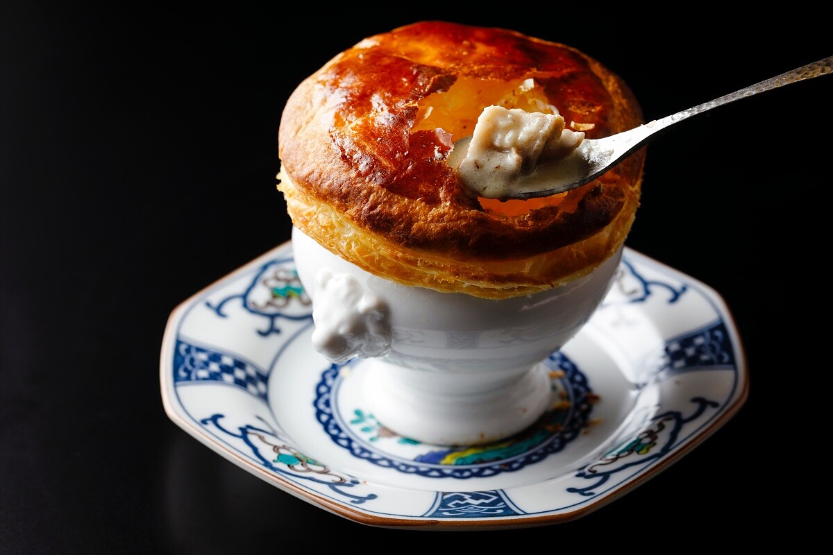 像是開場的「大和茶粥佐漬物」,靈感就是來自東大寺「取水節」期間,參籠修行的僧侶們流傳千年的晨間齋食。另道看似酥皮濃湯的「飛鳥鍋」,其實來自奈良的傳統料理。 原來日本飲用牛奶的習慣,可以追溯到奈良時代,主廚將其轉化為法式的酥皮燉菜形式,以細緻的派皮重新詮釋。主菜則有奈良在地的「大和牛」,搭配的是米麴醬汁、八角風味的湯品,肉質軟嫩、油脂細緻,入口後會慢慢釋放出層層肉汁。