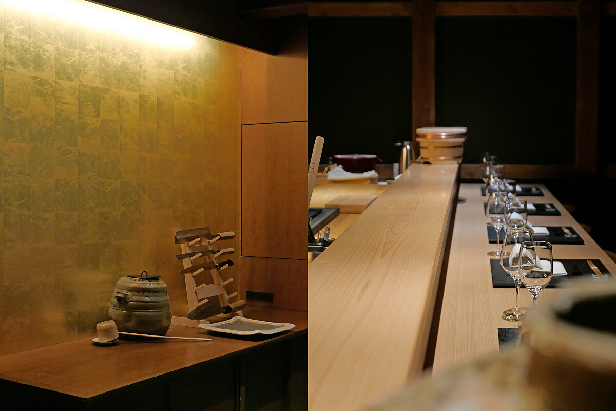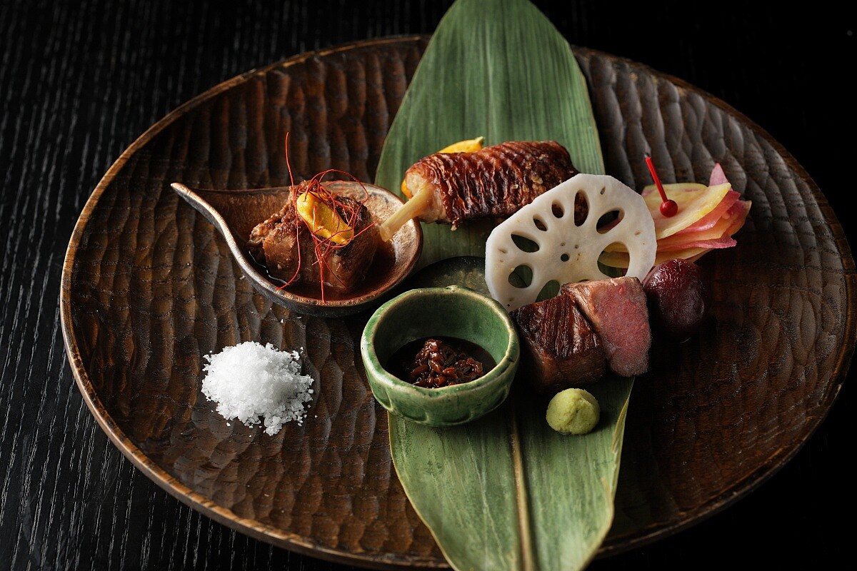 主餐廳「翠葉」(Suiyou)空間有著通透的四面落地窗,吊燈則取自春日大社的萬盞燈籠。我們在包廂空間「 紫檀 」享用了名為「時河」(Tokika)的晚宴,其概念來自奈良的傳統飲食文化。