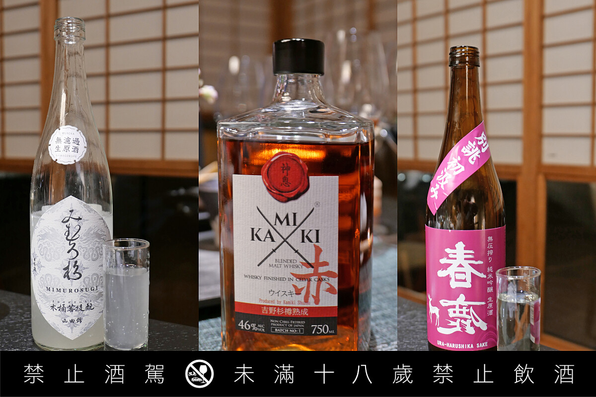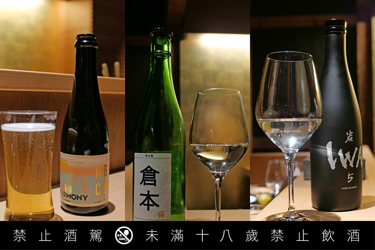酒單的安排與「翠葉」同邏輯,並不局現在清酒上,而是橫跨了奈良當地酒造、茶、葡萄酒,像是長油酒造的「風の森」、倉本酒造釀造「倉本純米酒」,抑或是奈良釀造生產的白啤酒、上久保茶園的單品茶;甚至延伸至其他產地,有甲州白酒與黑皮諾等葡萄酒,甚至連富山的 IWA 5 也被納入其中。