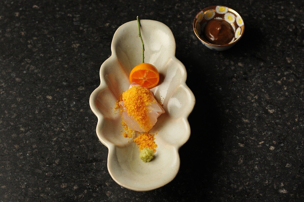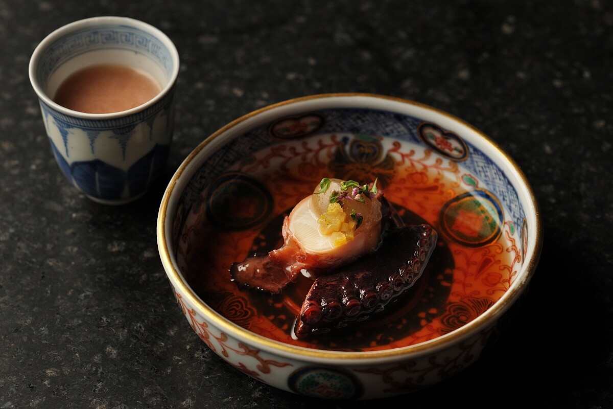 「正倉院形向付八曲長杯」,靈感來自古代盛清酒的酒器,正倉料理長用以重新詮釋。 印象深刻的有「柔煮章魚」搭配轉化為泡沫的奈良鄉土料理「茶粥」,再以庭園自種柚子提味,味道溫和卻有層次。接著是盛裝在仿「正倉院器形」、由赤膚燒(日本奈良的傳統陶器)名家製作的器皿中的鯛魚刺身,撒上烏魚子粉,並以古老的發酵調味「醬」帶出旨味;壽司也不乏江戶前手法處理的亮皮魚,以及別出心裁的「蝦之三趣」,將車海老、甘海老與波士頓龍蝦拆解再組合,從握壽司、酥炸到濃縮高湯,一層一層堆出不同的口感與濃度。