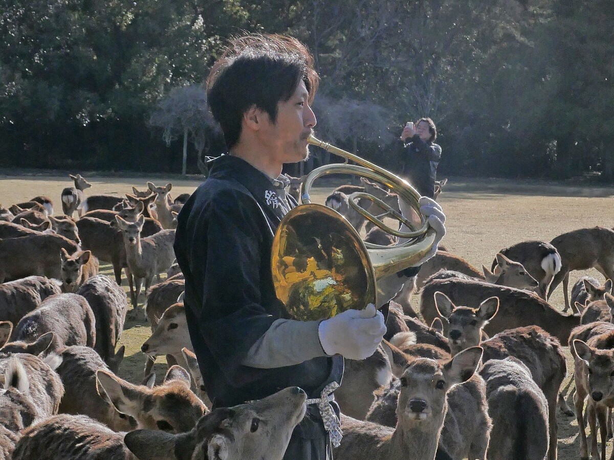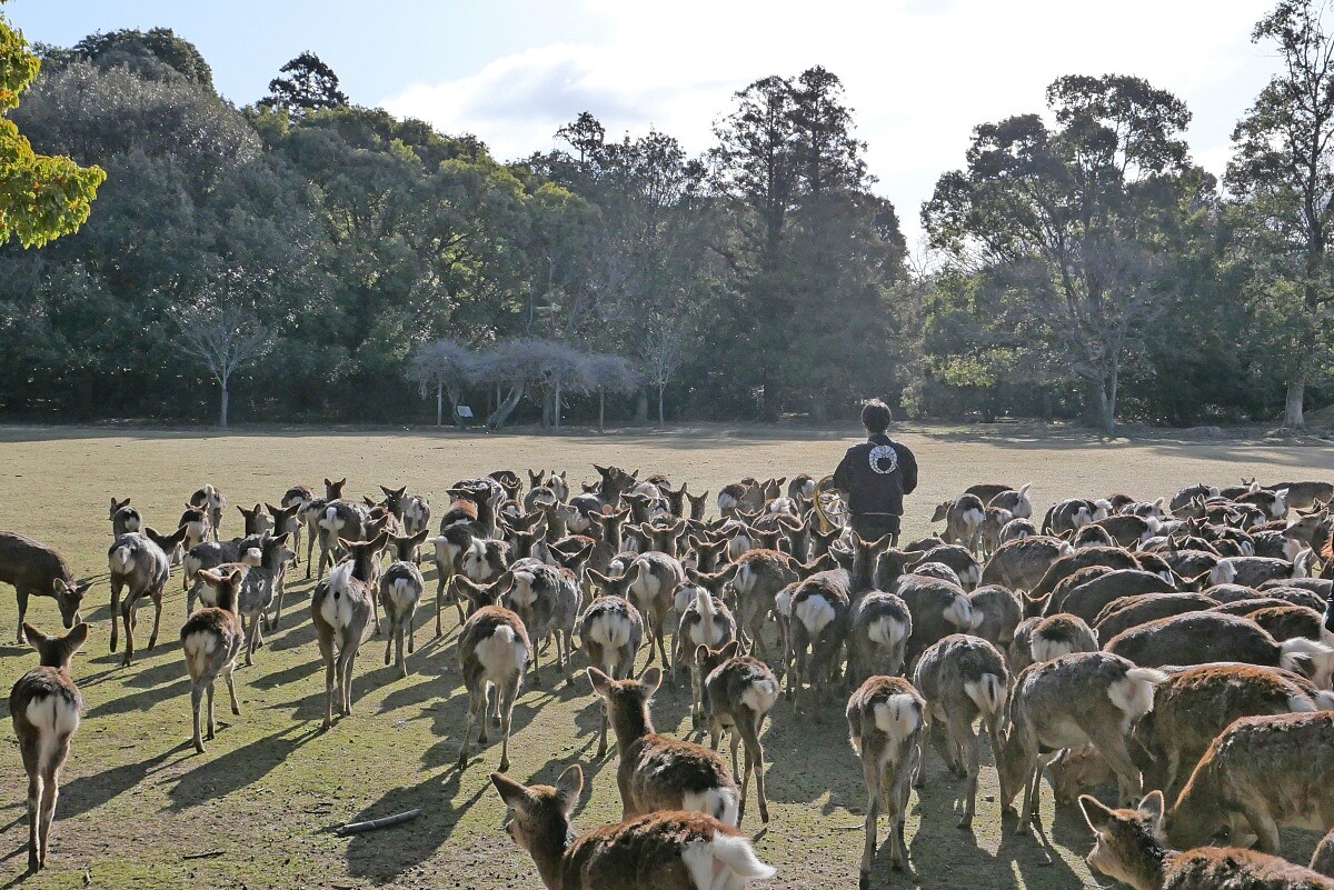 最後一天清晨,我們走向奈良公園。當工作人員吹起法國號,鹿群從森林、草原各處緩緩聚攏,那個畫面神聖且壯闊,完全不像在任何旅遊指南裡看過的奈良。
