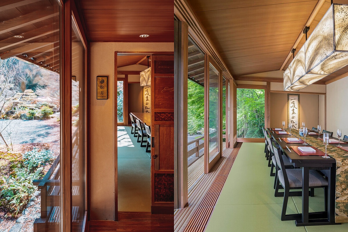 環顧空間,醒目的「延命閣」三個字高掛在樑柱上,京都翠嵐總經理高木忍說,這是川崎家族所留下的命名,起名的人認為在如此優美的環境下生活,會讓人延年益壽。坐在這裡搭配遠方的山景吃完午餐,你大概也會覺得,這名字取得還蠻貼切的。 此外,餐廳內也設有名為「松月」的私人包廂空間,這裡可成為獨立宴客的場地,獨享面向保津川的景色。