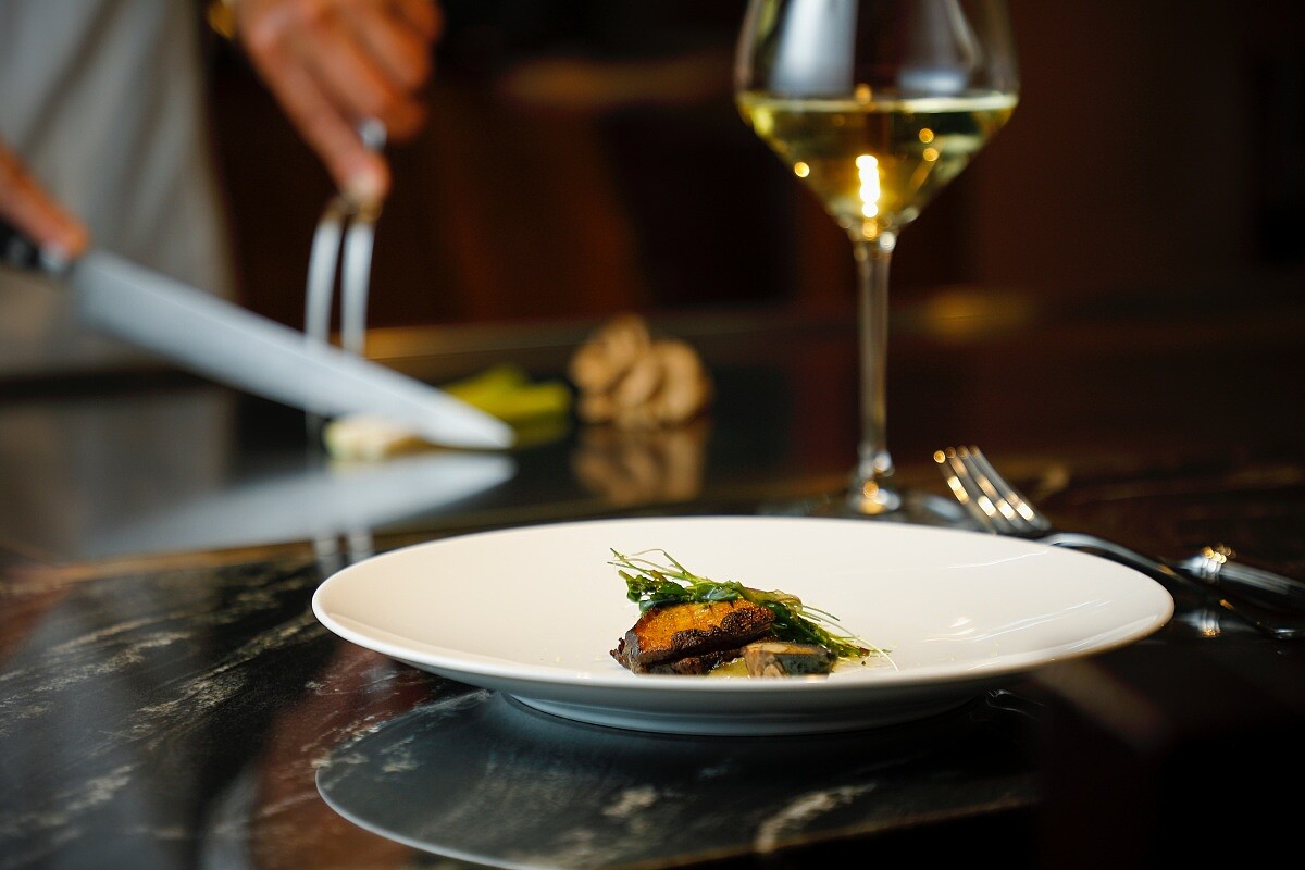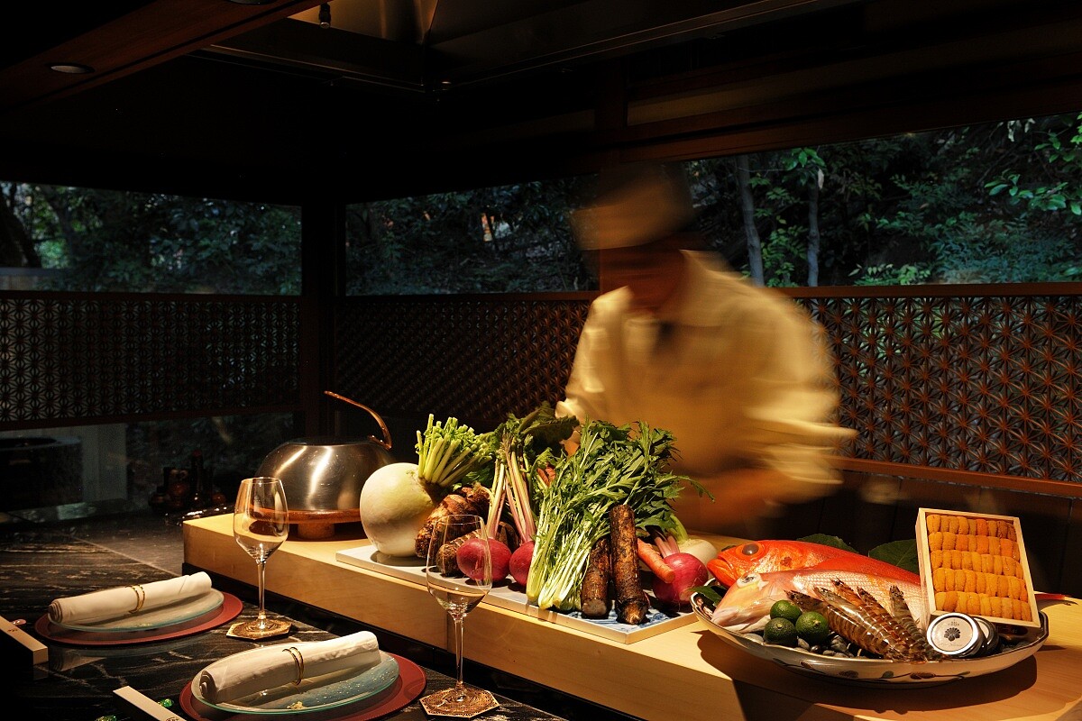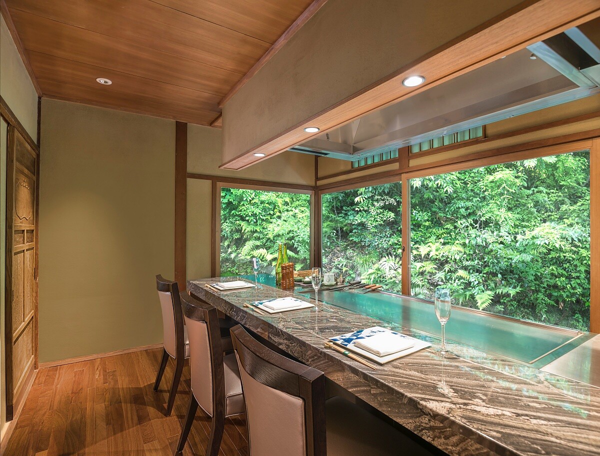 可預約鐵板燒套餐,透過板前即時料理呈現和牛、龍蝦等食材;亦可選擇主廚餐桌「KAPPOU」割烹形式,由主廚依當日食材安排菜序,結合壽司、天婦羅與各式料理。