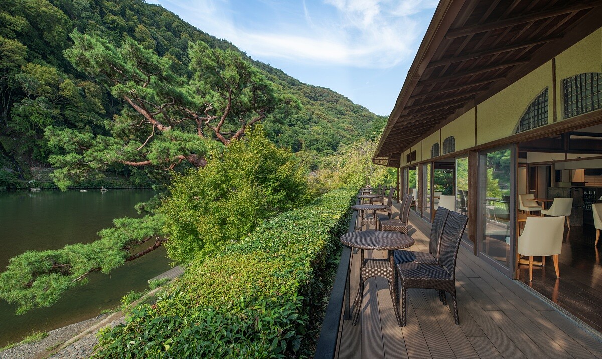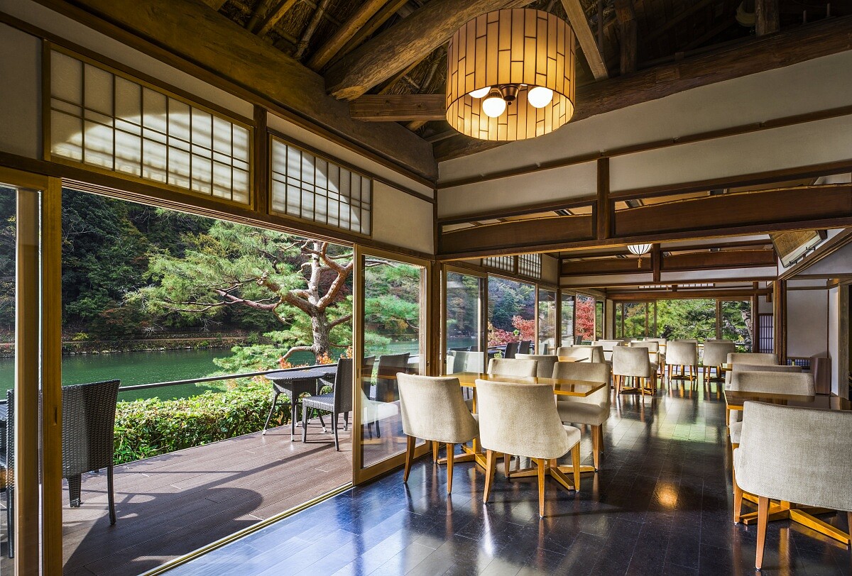 但和多數新建飯店不同,它沒有用大規模開發去重新改建,而是維持既有的建築,加入現代的設備在空間裡頭。整個園區為三層樓低矮建築,屋頂採傳統瓦片形式,這是為了避免遮擋嵐山山形與保津川視線,讓旅人在每一次的移動、停留,都能有絕無僅有的風景陪伴。公共空間的動線圍繞庭園與河岸展開,大面積落地窗讓室內幾乎沒有明確邊界。從入口、大廳到餐廳與茶寮,視線會一直被引導到外面的山與水,直接讓「風景」變成空間的一部分。