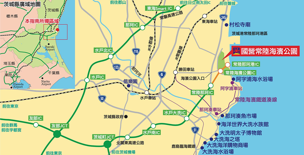| 東京出發交通 | JR 勝田站東出口轉乘「海濱公園」接駁巴士。 | JR 車程約85分鐘,巴士約15分鐘抵達。 |