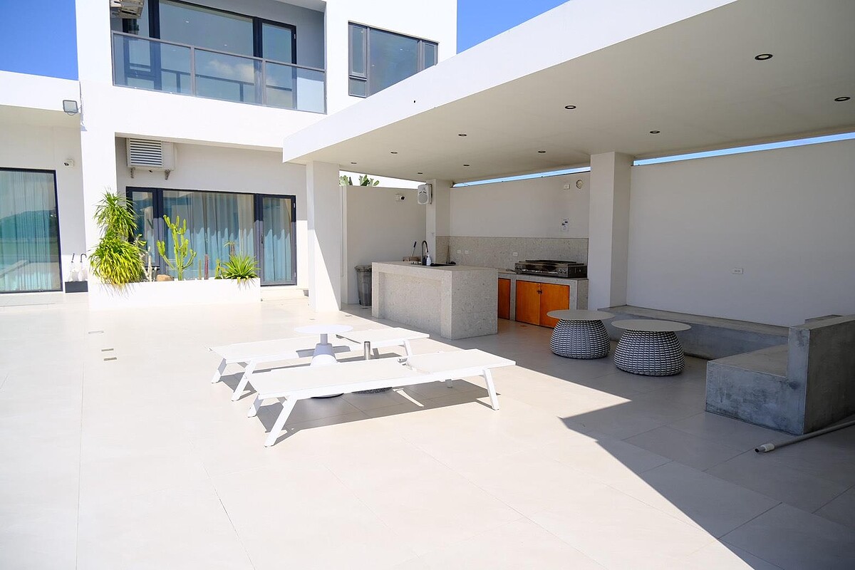 10米×5米的戶外泳池是整棟Villa的靈魂所在,也是小編最愛的一隅。當白天陽光灑在藍色水面上,波光粼粼;傍晚夕陽西下時,整個泳池像被濾鏡加持,浪漫到不行。泳池旁有戶外沙發區與半戶外烤肉區,瓦斯烤爐、餐桌椅一應俱全,還能代訂烤肉食材。晚上泳池開燈後,水面倒映著天空與燈光,躺在池畔沙發上吹風,真的幸福感滿滿。