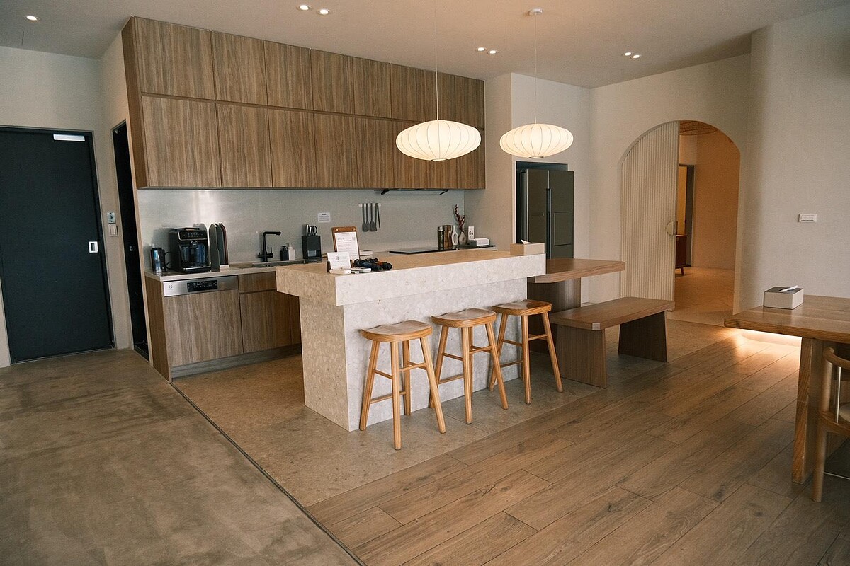 「25度C日光」一間專為包棟設計的豪宅式Villa,一次只接待一組客人,最高可容納18~22人。三層樓共有三間雙人房與三間四人房,床型皆為加大雙人床,二、三樓雙人房還能額外加一張雙人沙發床。空間寬敞到可以翻滾,奶茶色系的客廳與開放式廚房更是大到誇張,每一張照片拍出來都像雜誌封面。