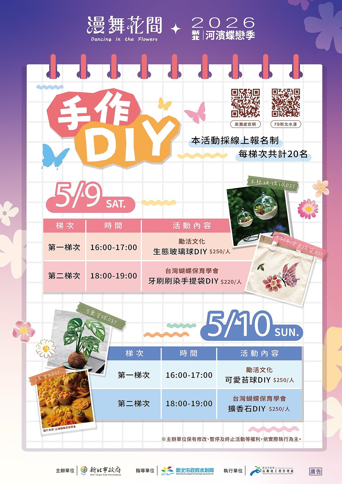 5月必衝療癒花海!新北市河濱年度重點活動:「2026新北河濱蝶戀季・漫舞花間」,2026年升級話題熱度!首度攜手三麗鷗人氣角色IP「布丁狗」,將可愛的黃色身影與地植花海結合,更有升級版蝴蝶光環境及五大超萌裝置藝術,消息一出便在Threads上引發討論,成為母親節檔期最受矚目的親子與拍照景點之一。