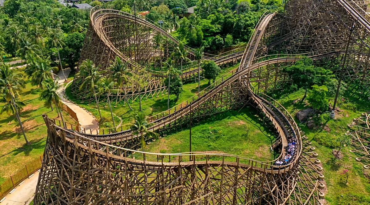 搭乘纜車抵達後的終點站。園內擁有大規模的水上樂園(Aquatopia Water Park)和「木蛇」木造雲霄飛車。這裡的植被茂密,充滿了熱帶冒險的氛圍。
