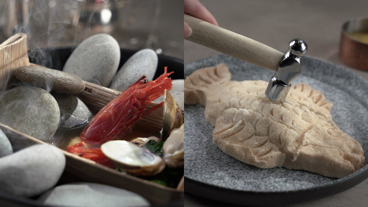 熱前菜為月桃葉鹽封烤製的新鮮海魚,入口後能享受帶著鮮甜、水分彈性、月桃葉清新香氣的魚肉;主餐為肉質細緻的阿美族風味烤雉雞,並有著小米酒與醬燒尾韻,搭配當季的水果作清爽又解膩。湯品為採用「檳榔葉鞘」為器的海鮮熱湯,採用原民「熱石」傳統烹飪方式加溫,搭配大文蛤、宜蘭胭脂蝦,是東海岸原始旨味的絕佳呈現。尾盤甜點則由煙燻布丁與台東「小米甜甜圈」收尾,交織出呼應土地的美好餘韻。