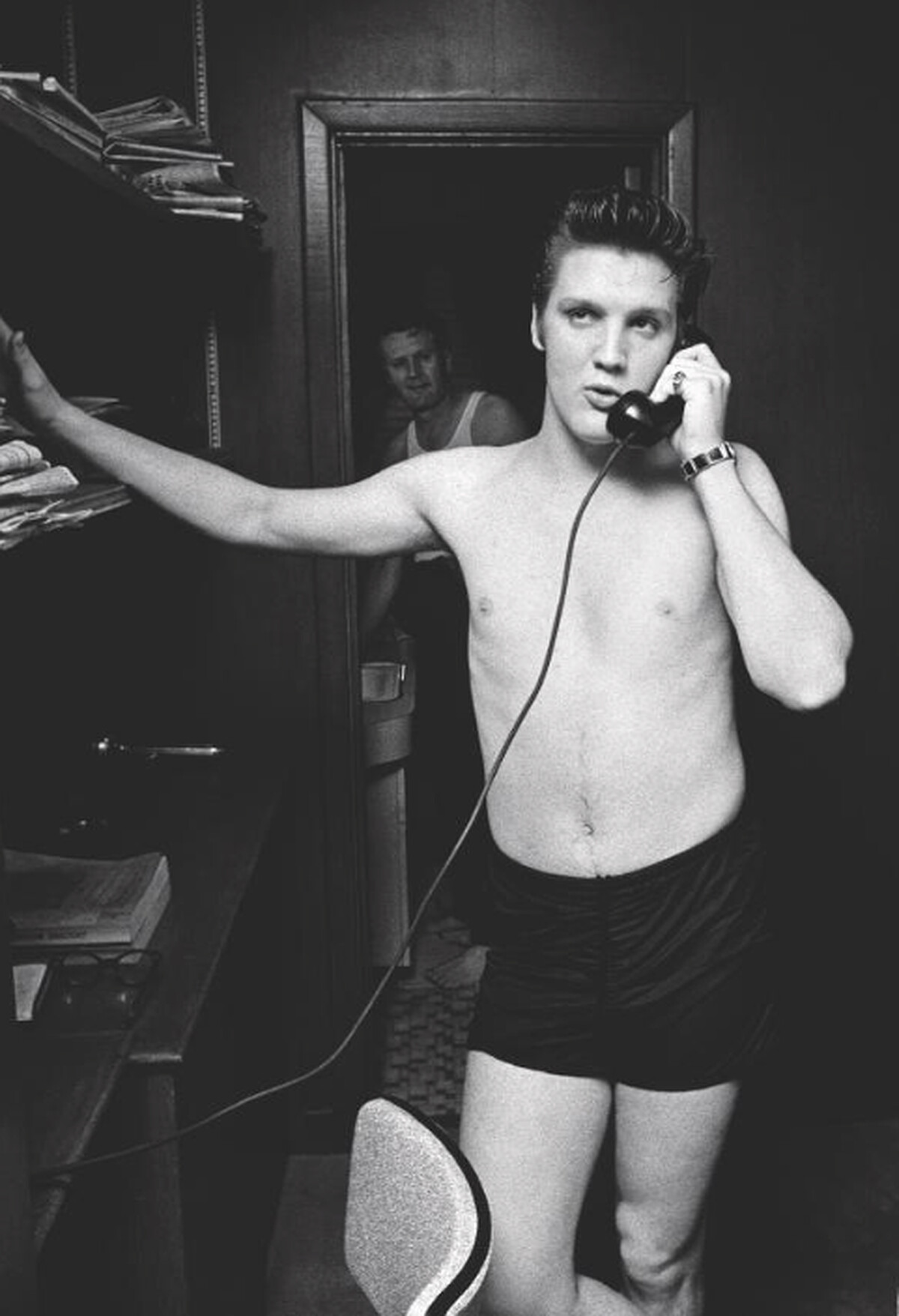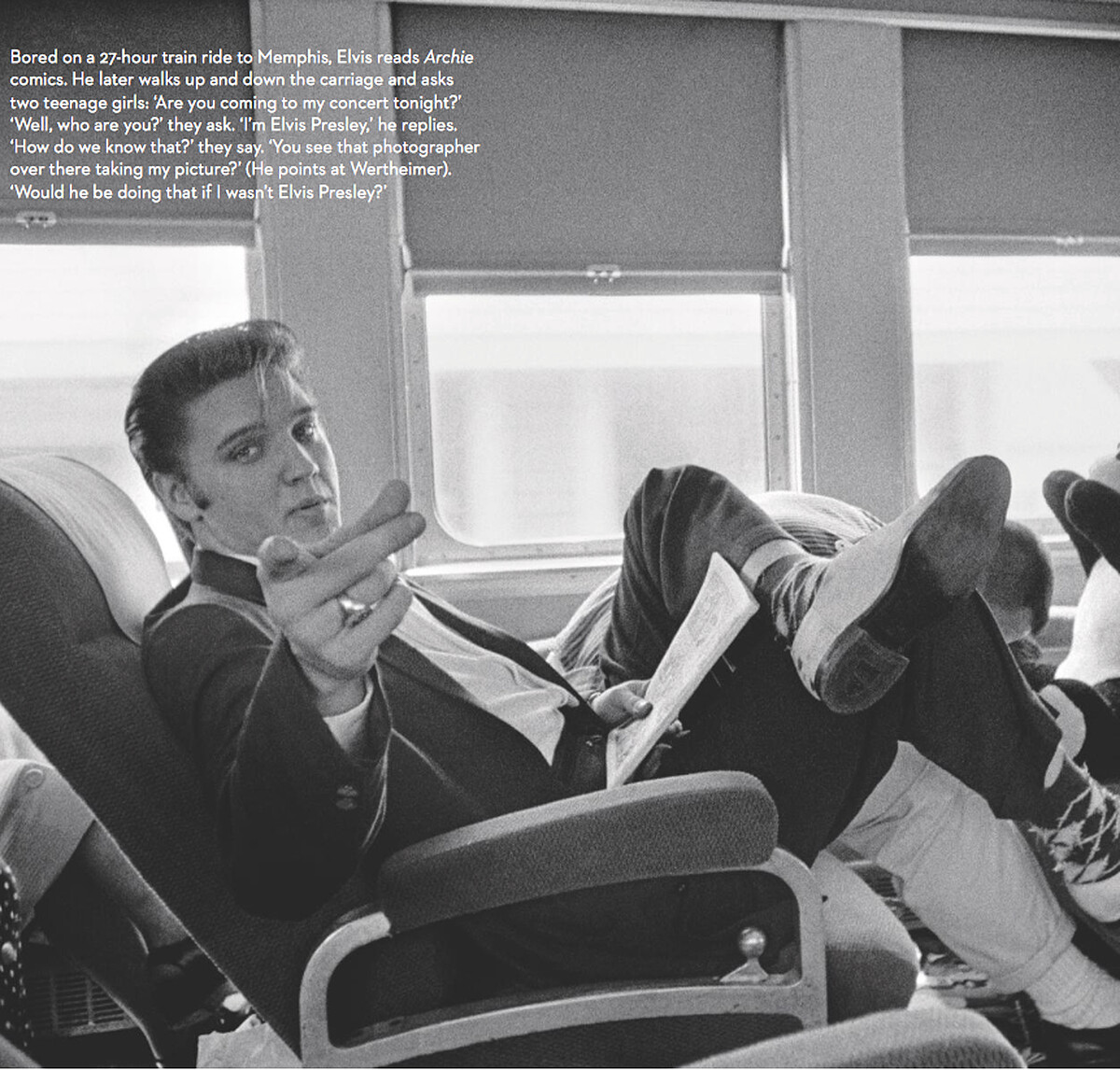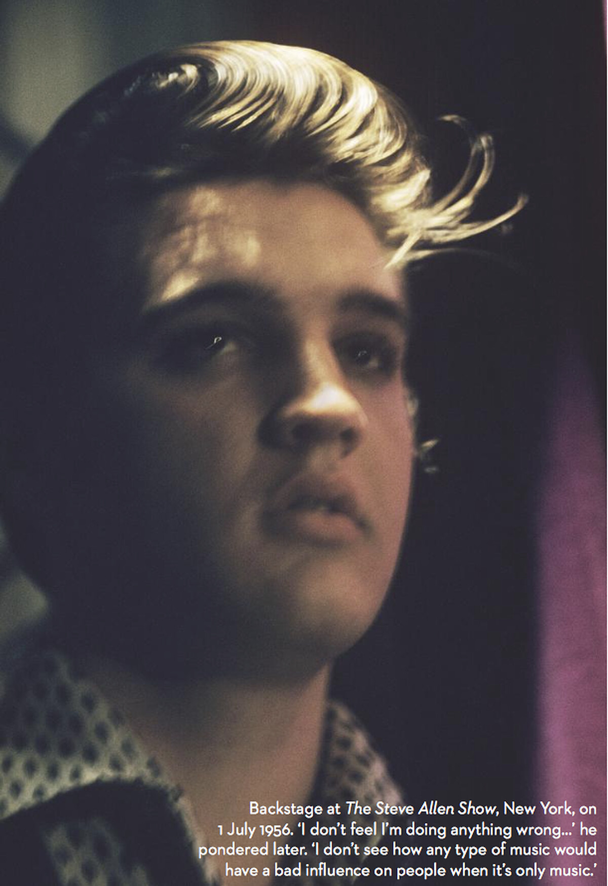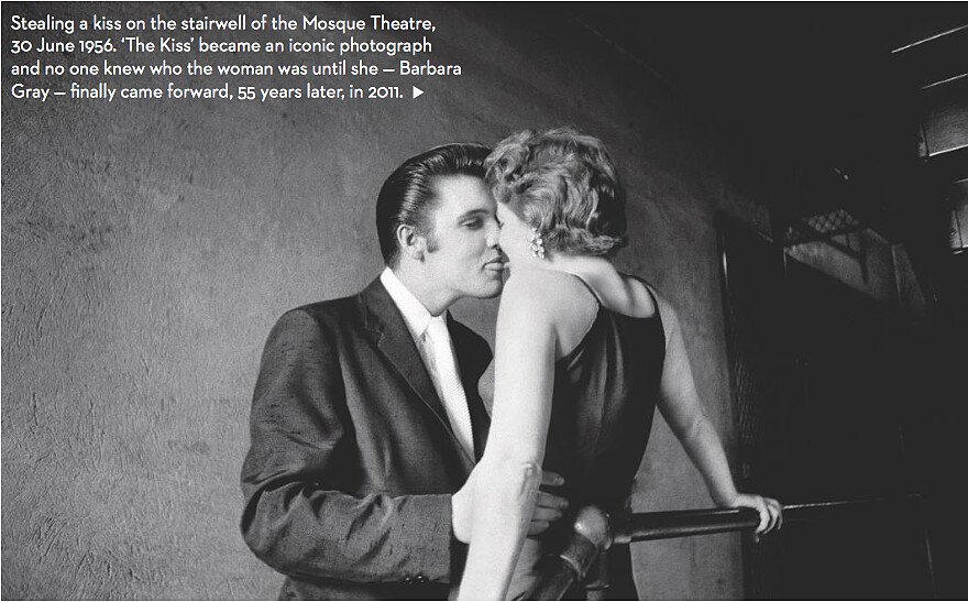 回憶當年,攝影師 Wertheimer 被RCA唱片公關要求貼身拍攝一位「新歌手」——Elvis,當他聽到這名字時,還頓時反應不過來問說:「誰是 Elvis?」在這段時間裡,Wertheimer 被允許跟隨貓王到任何地方,捕捉了超過2,500張照片,也留下了許多令人驚嘆的私密畫面,好比貓王曾在 Mosque 劇院樓梯間裡,偷偷和一名女子親暱接吻,直至2011年這名女子的身份才總算揭曉;又或者,畫面上的貓王僅穿著貼身四角褲,在自宅裡講著電話,身後正在刮鬍子的背景人物,就是貓王的父親。