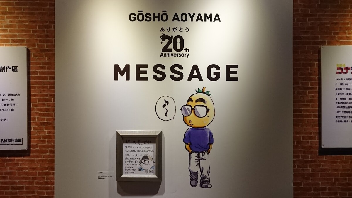 剛進到【連載20周年創作區】,馬上就看到常在漫畫扉頁出現、作者青山岡昌老師的自畫像,以及他寫給參觀民眾的一段話,相信粉絲們會感受到青山老師對展覽策畫的用心和期待!