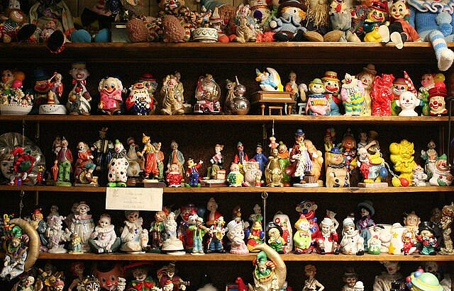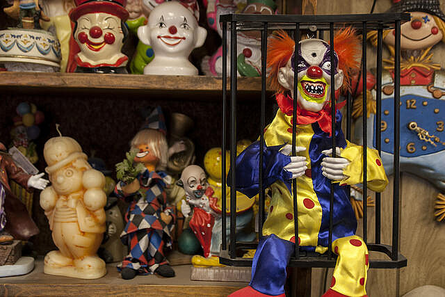 但假使你再深入一點、走到辦公室當中,就會可能會被突然出現的數百隻小丑玩偶嚇破膽,因為,他們正一起裂著鮮紅色的大嘴對你微笑,笑到你心寒⋯⋯