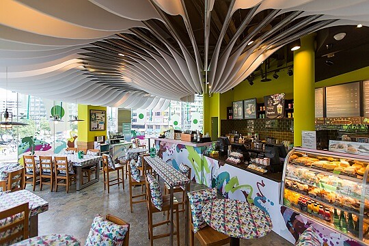 位於台北統一時代百貨,這間星巴克門市以鮮黃色為主色系,從天花板、門市窗格、桌椅到店員制服都換上奔放歡樂的新裝飾,充滿夏季活潑感,更搶先全台門市推出全新2款夏季限定星冰樂「巧克力伯爵紅茶吉利星冰樂」、「義式濃縮奶霜脆餅星冰樂」,另有本店限定飲品「巧克力抹茶可可碎片星冰樂」及「歡樂霓彩」限量星冰樂隨行卡。