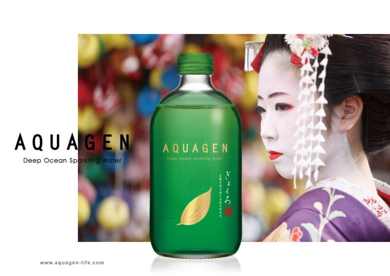 今年AQUAGEN實驗性全新概念創作,融合京都宇治玉露的茶道文化及藝妓表演藝術者的靈魂,體悟以前所未見的風味口感與敘事品牌方式,大刀闊斧展現商品新氣象,不再侷限於過去深海氣泡水的經典風味。國際品牌經理蔡侑霖(Danny TSAI)表示:「茶與水這兩件事,在傳統每日生活中,是密不可分!早些日子的日本,把沒有經過藝術培訓而在聚會上倒茶水的女性稱為『酎婦』,地位非常卑微。這回,AQUAGEN總部團隊深入走訪日本京都,透徹研究千年古都-京都過去的歷史及背景。當宇治玉露配合傳統藝妓的茶汲女文化,而誕生全球第一瓶深海水-日本京都宇治玉露風尚系列」。