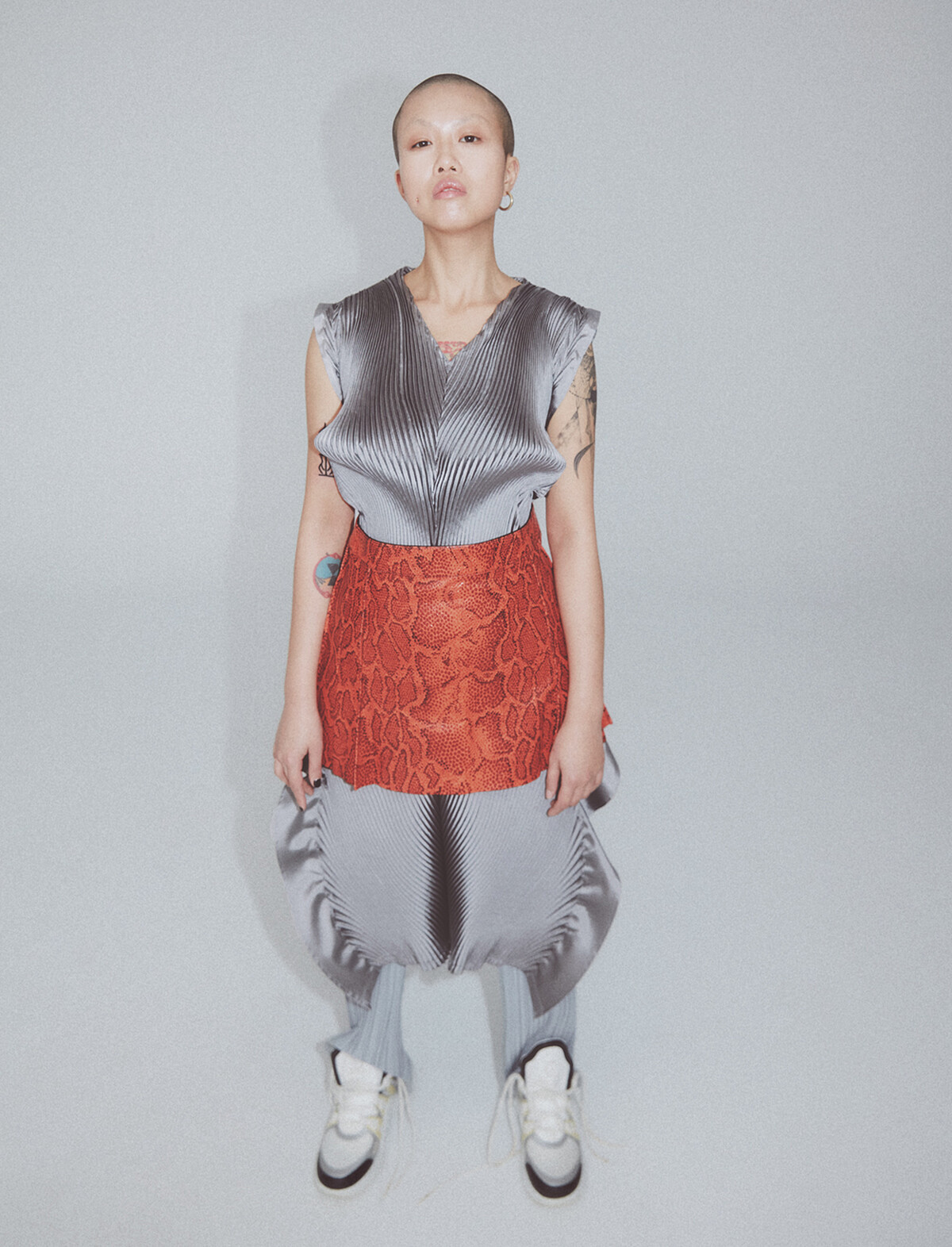 (壓褶洋裝、長褲,both by Issey Miyake;蛇紋皮裙,Chloé,球鞋,Louis Vuitton。)